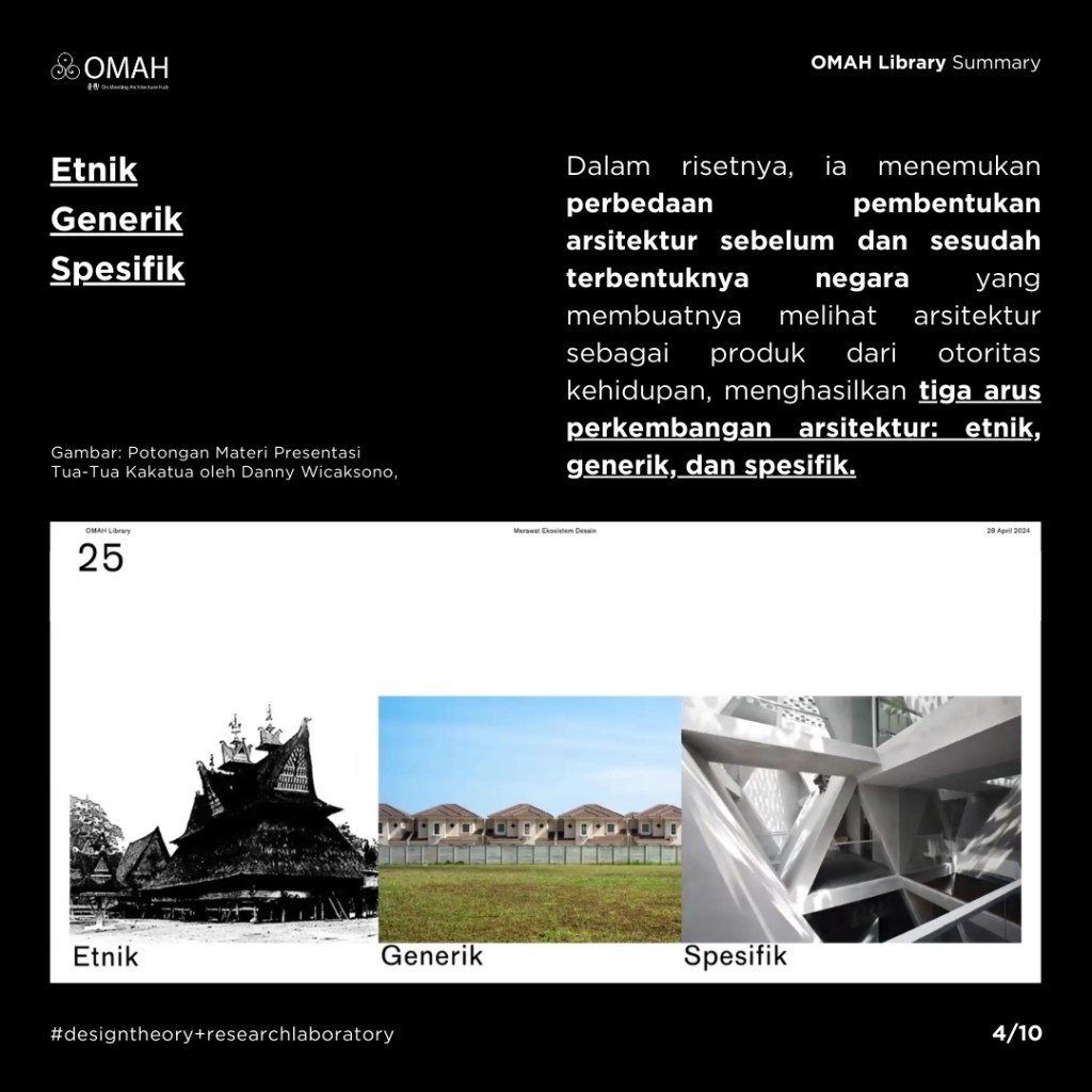 Dalam risetnya, ia menemukan perbedaan pembentukan arsitektur sebelum dan sesudah terbentuknya negara yang membuatnya melihat arsitektur sebagai produk dari otoritas kehidupan, menghasilkan tiga arus perkembangan arsitektur: etnik, generik, dan spesifik.