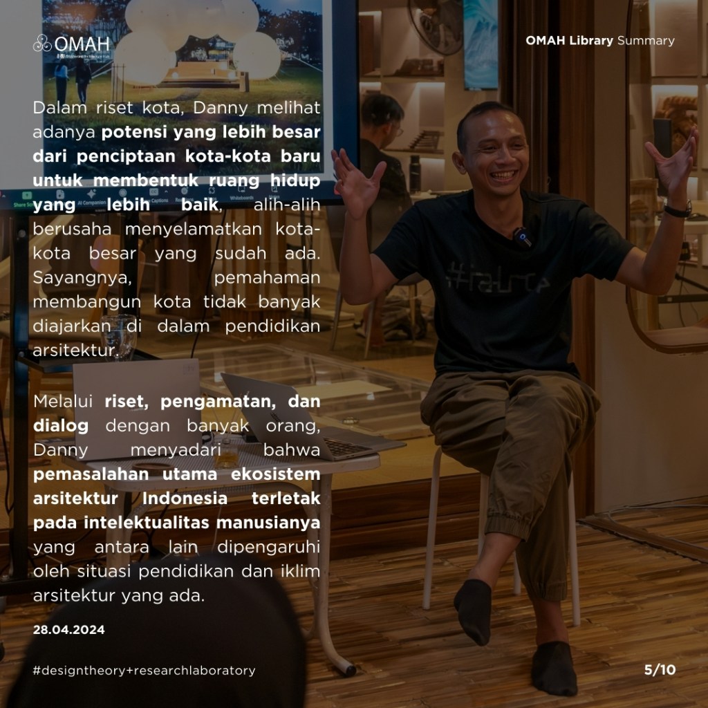 Melalui riset, pengamatan, dan dialog dengan banyak orang, Danny menyadari bahwa pemasalahan utama ekosistem arsitektur Indonesia terletak pada intelektualitas manusianya yang antara lain dipengaruhi oleh situasi pendidikan dan iklim arsitektur yang ada.