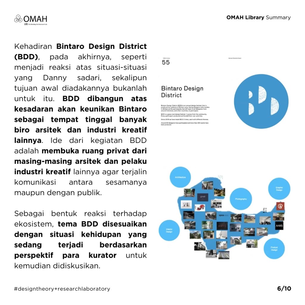 Kehadiran Bintaro Design District (BDD), pada akhirnya, seperti menjadi reaksi atas situasi-situasi yang Danny sadari, sekalipun tujuan awal diadakannya bukanlah untuk itu. BDD dibangun atas kesadaran akan keunikan Bintaro sebagai tempat tinggal banyak biro arsitek dan industri kreatif lainnya. Ide dari kegiatan BDD adalah membuka ruang privat dari masing-masing arsitek dan pelaku industri kreatif lainnya agar terjalin komunikasi antara sesamanya maupun dengan publik.