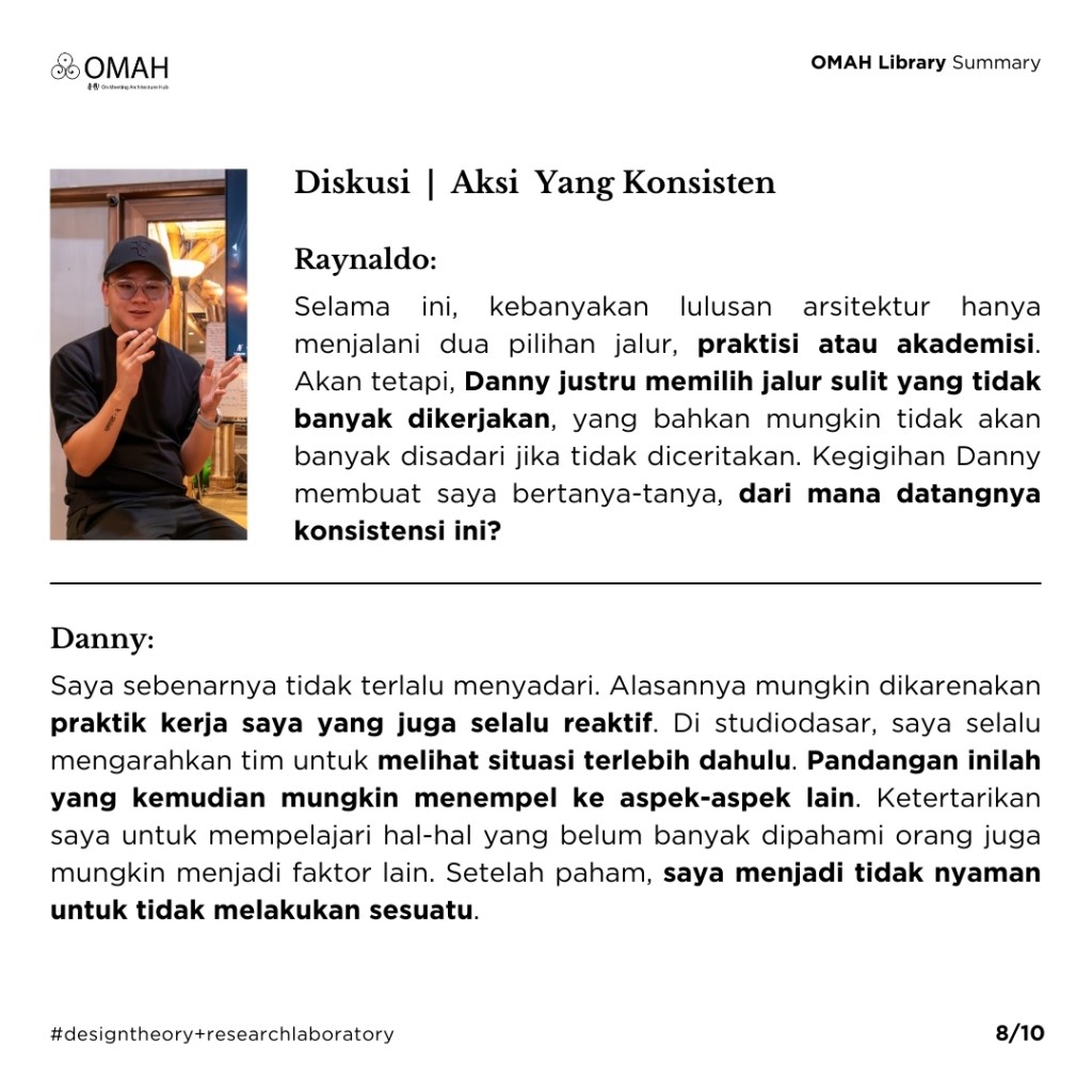 Selama ini, kebanyakan lulusan arsitektur hanya menjalani dua pilihan jalur, praktisi atau akademisi. Akan tetapi, Danny justru memilih jalur sulit yang tidak banyak dikerjakan, yang bahkan mungkin tidak akan banyak disadari jika tidak diceritakan. Kegigihan Danny membuat saya bertanya-tanya, dari mana datangnya konsistensi ini?
