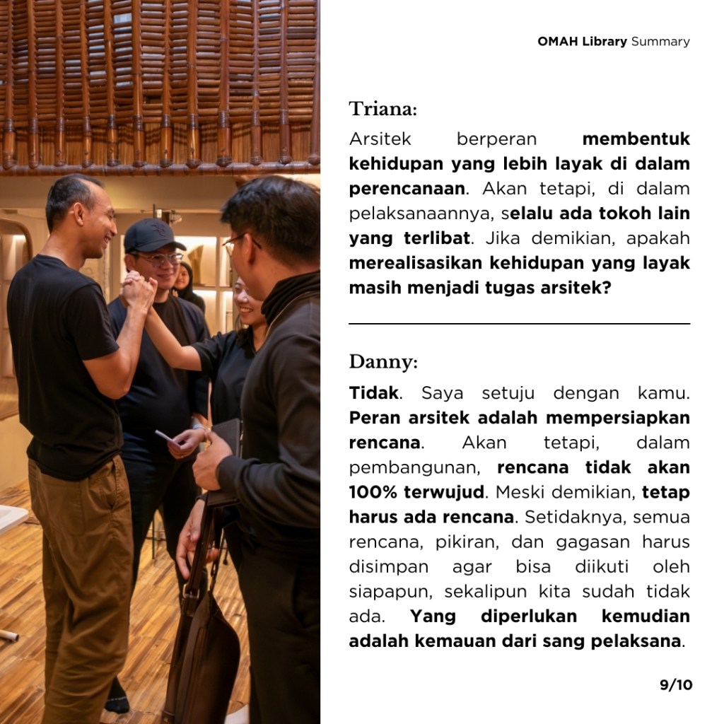 Tidak. Saya setuju dengan kamu. Peran arsitek adalah mempersiapkan rencana. Akan tetapi, dalam pembangunan, rencana tidak akan 100% terwujud. Meski demikian, tetap harus ada rencana. Setidaknya, semua rencana, pikiran, dan gagasan harus disimpan agar bisa diikuti oleh siapapun, sekalipun kita sudah tidak ada. Yang diperlukan kemudian adalah kemauan dari sang pelaksana.