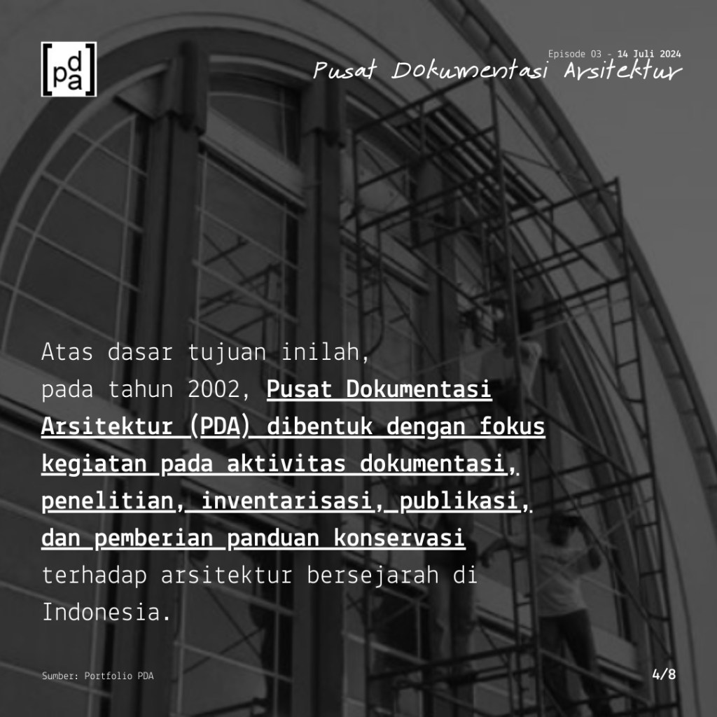 Atas dasar itu, pada tahun 2002, Pusat Dokumentasi Arsitektur (PDA) dibentuk dengan fokus kegiatan pada aktivitas dokumentasi, penelitian, inventarisasi, publikasi, dan pemberian panduan konservasi arsitektur bersejarah. PDA juga aktif mengadakan pelatihan dan pendidikan untuk meningkatkan kepedulian dan pemahaman terhadap konservasi. Salah satu program yang cukup rutin diadakan adalah “Obrolan Heritage” dengan mengundang pembicara-pembicara untuk mendiskusikan isu-isu arsitektur Indonesia secara umum dan heritage secara khusus.