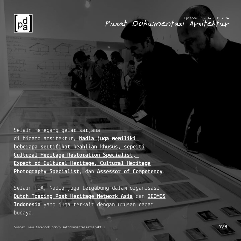 Nadia Purwestri, sebagai salah satu direktur eksekutif PDA, merupakan seorang lulusan arsitektur Universitas Tarumanagara. Dirinya telah terlibat dalam kegiatan riset, dokumentasi, dan publikasi arsitektur dengan ketertarikan utama terhadap heritage sejak sebelum PDA didirikan. Selain PDA, Nadia juga tergabung dalam organisasi Dutch Trading Post Heritage Network Asia dan ICOMOS Indonesia yang juga terkait dengan urusan cagar budaya. Apa arti penting cagar budaya di mata Nadia Purwestri? Di mana posisi heritage dalam khazanah pengetahuan arsitektur? Isu apa yang menjadi penting disadari terkait heritage?