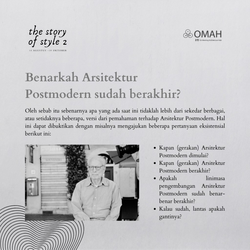 “Apa itu Arsitektur Postmodern? Benarkah ia sudah berakhir? Kalau sudah, lantas apakah gantinya? Kalau belum, apa yang membuatnya tak tergantikan?”