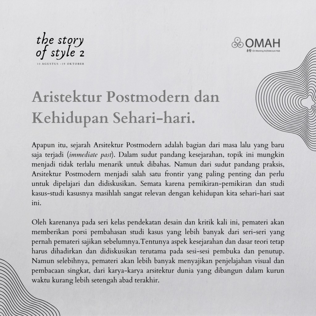 Pada seri SOS2 kali ini, pemateri akan mencoba untuk mendefinisikan ulang Arsitektur Postmodern; dengan menjelajahi karya-karya penting dari 36 arsitek kenamaan dunia.