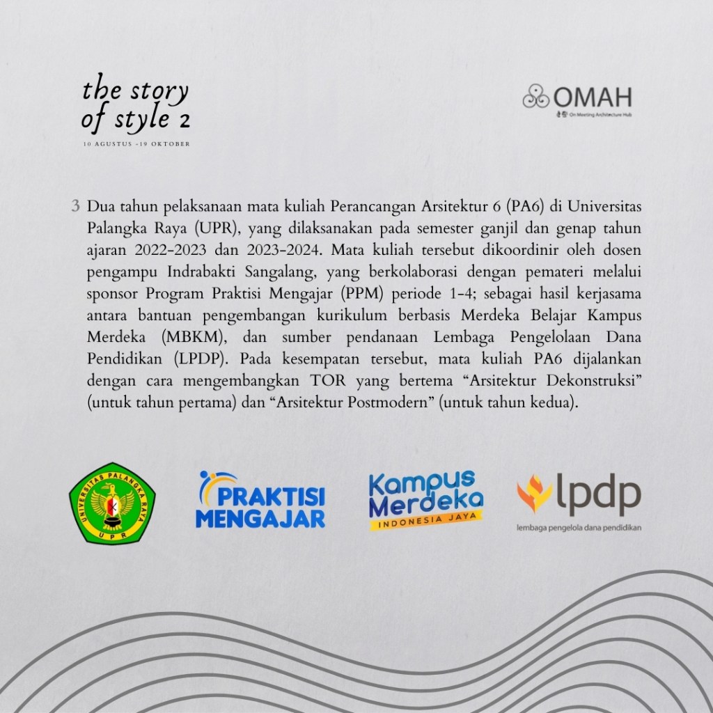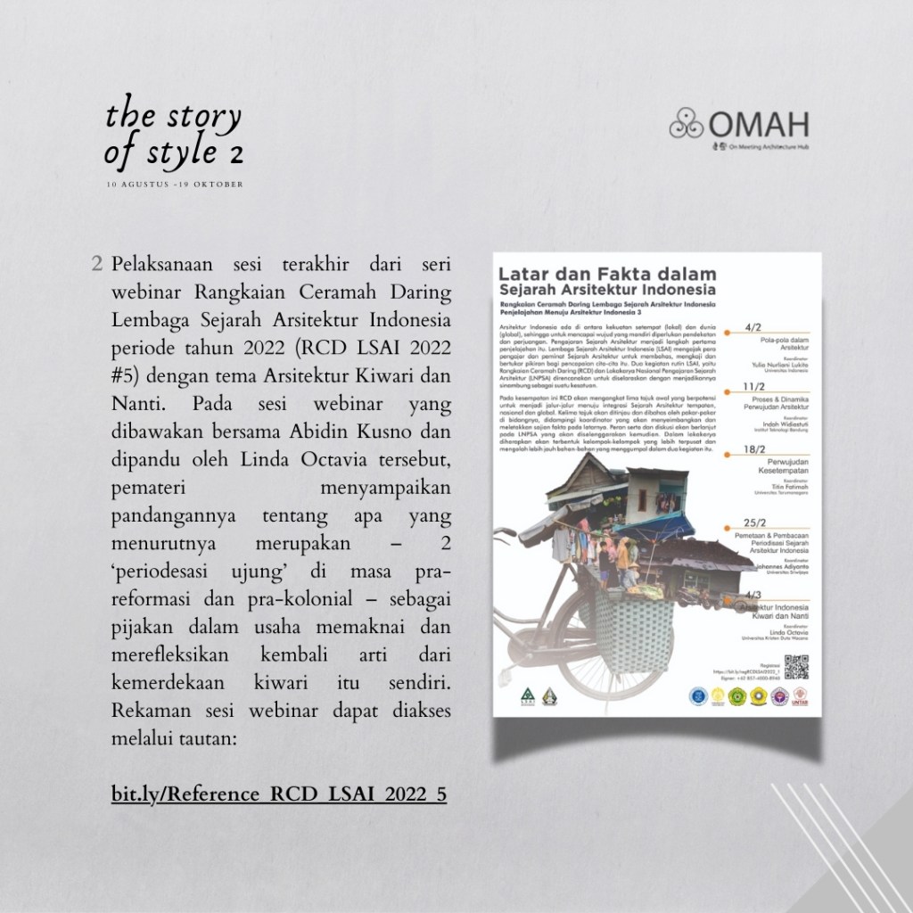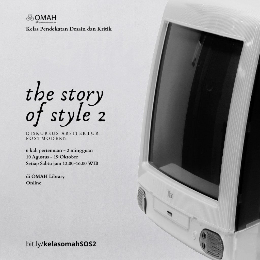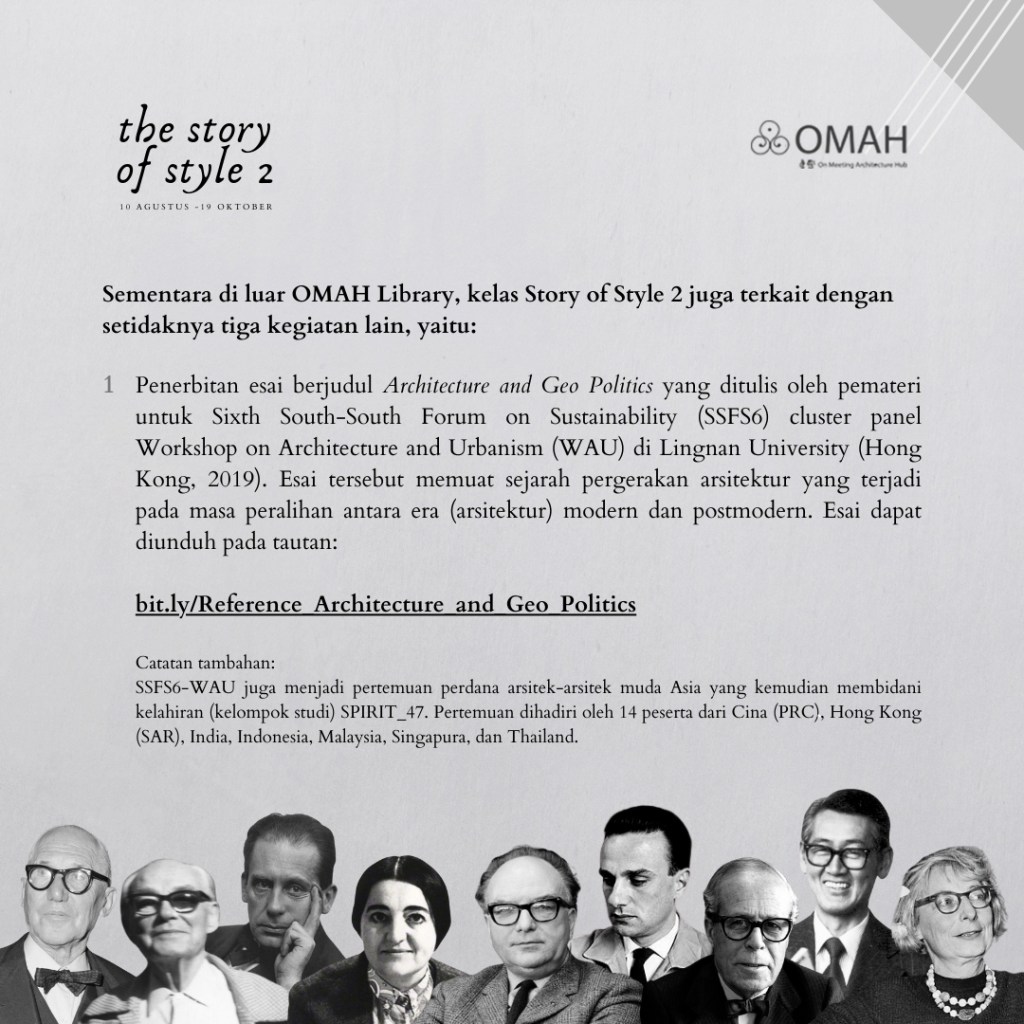 Kelas Story of Style 2 ini merupakan bagian dari usaha bersama untuk meramu sudut pandang historiografi arsitektur baru, melalui pemantikan berbagai diskursus yang dibangun secara kontinyu – baik di dalam maupun di luar Omah Library.