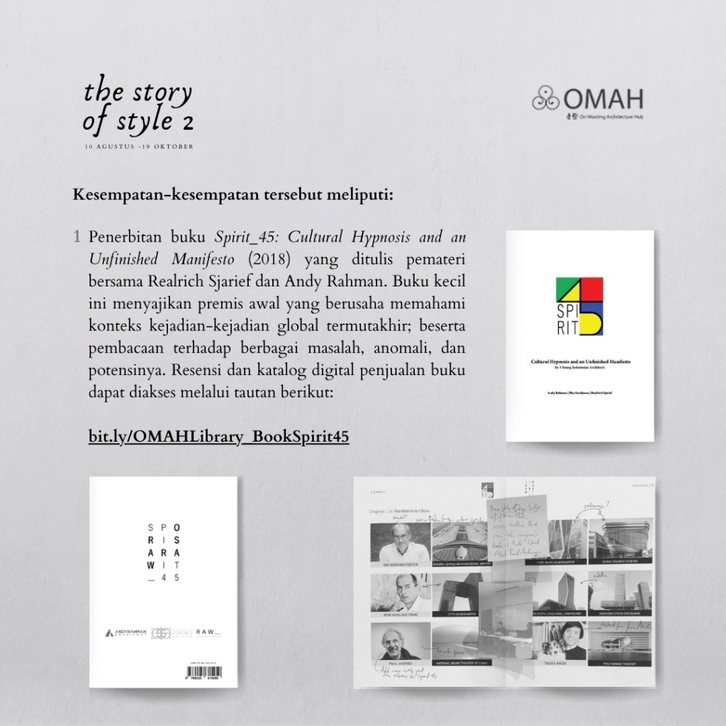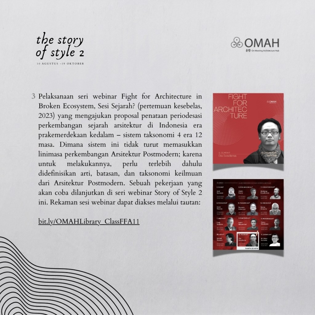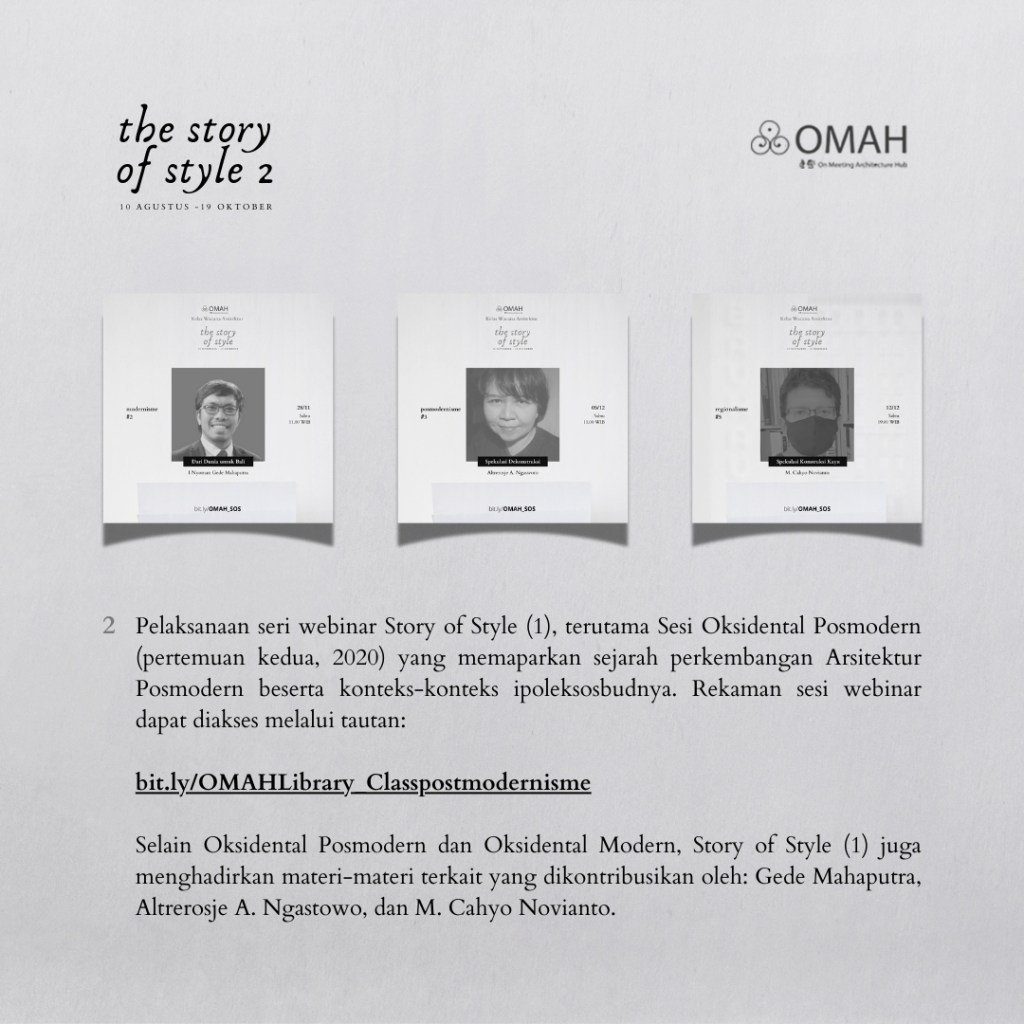 Di dalam Omah library, materi dalam kelas ini akan melanjutkan bahasan-bahasan yang sebelumnya telah pemateri sampaikan di buku Spirit_45 (2018), serta sesi Occidental Postmodernism pada serial Story of Style 1 (2020) dan sesi Sejarah? pada serial Fight for Architecture (2023).