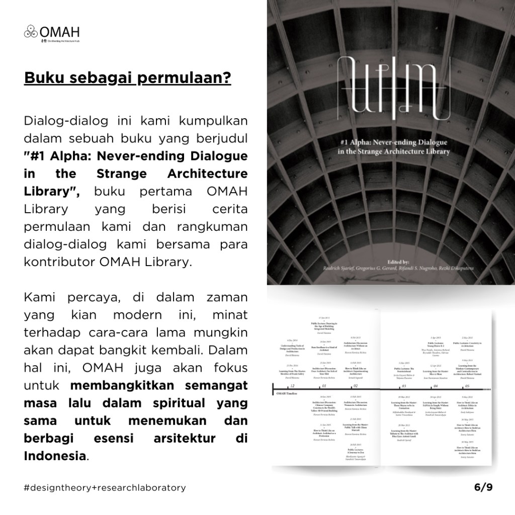 Dialog-dialog ini kami kumpulkan dalam sebuah buku yang berjudul “#1 Alpha: Never-ending Dialogue in the Strange Architecture Library”, buku pertama OMAH Library yang berisi cerita-cerita permulaan kami dan resensi dialog-dialog kami bersama para kontributor OMAH Library di tahun 2015.