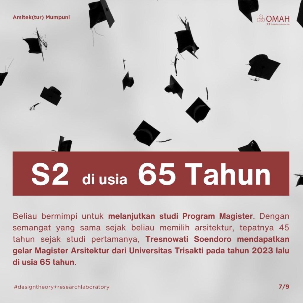 Usia mungkin menua, namun mimpi selalu ada. Pada tahun 2023 ketika Tresnowati Soendoro berusia 65 tahun, beliau akhirnya mendapatkan gelar Magister Arsitekturnya dari Universitas Trisakti. Seperi kata Anne Frank, di mana ada mimpi, di situ ada kehidupan, selama itu disertai dengan perjuangan.