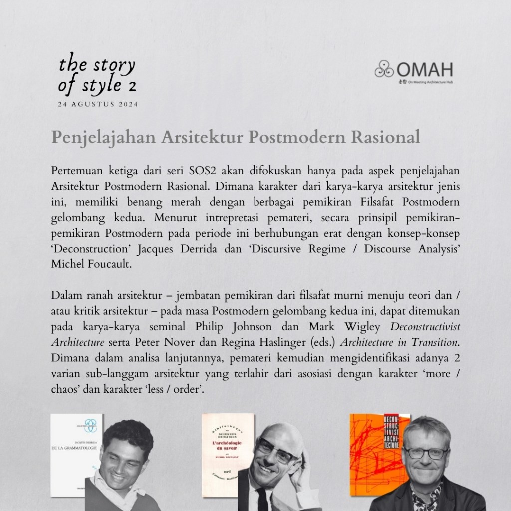 Pertemuan ketiga dari seri SOS2 akan difokuskan hanya pada aspek penjelajahan Arsitektur Postmodern Rasional. Dimana secara prinsipil, karakter dari karya-karya arsitektur pada periode ini berhubungan erat dengan berbagai pemikiran Jacques Derrida, Michel Foucault, Mark Wigley, dan Peter Nover.
