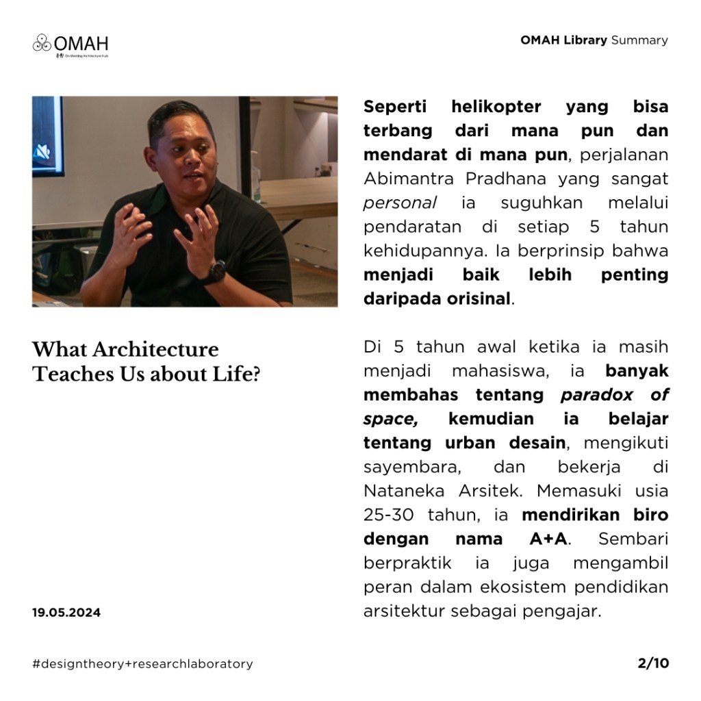 Dari paparan kelas Bittersweet Memories in Design Experience bersama Abimantra Pradhana, kita mendapat pengalaman untuk menyelami perjalanan Abimantra seperti sedang dibawa menaiki helikopter. Penerbangan yang sangat personal, kita bisa pergi dari mana pun, dan mendarat di mana pun. Kemudian Abi menyuguhkan destinasi di setiap 5 tahun perjalanannya. Ia berprinsip bahwa menjadi baik lebih penting daripada orisinal. Di dalam perjalanannya ia menyadari bahwa memiliki adalah kunci untuk bisa melakukan banyak hal.
