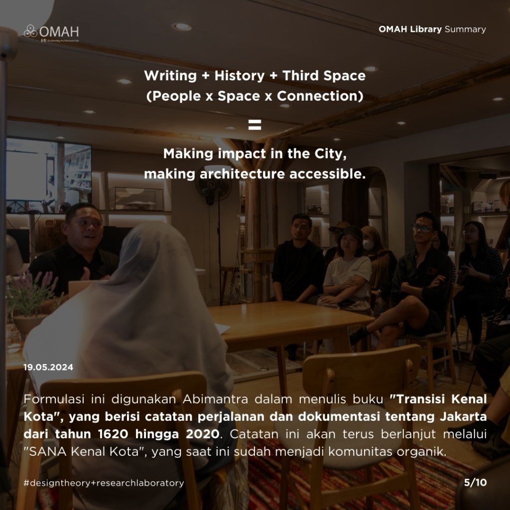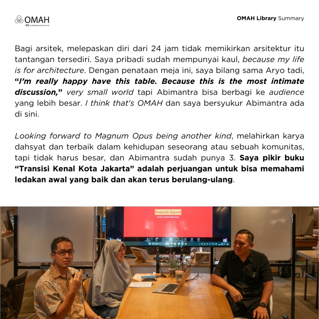 Formulasi Abi “Writing + History + Third Space (People x Space x Connection) = Making impact in the City, making architecture accessible.”. Membawanya menulis buku “Transisi Kenal Kota”, yang berisi catatan perjalanan dan dokumentasi tentang Jakarta dari tahun 1620 hingga 2020. Catatan ini akan terus berlanjut melalui “SANA Kenal Kota”, yang saat ini sudah menjadi komunitas organik.