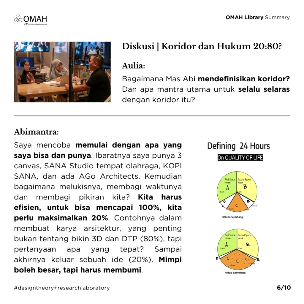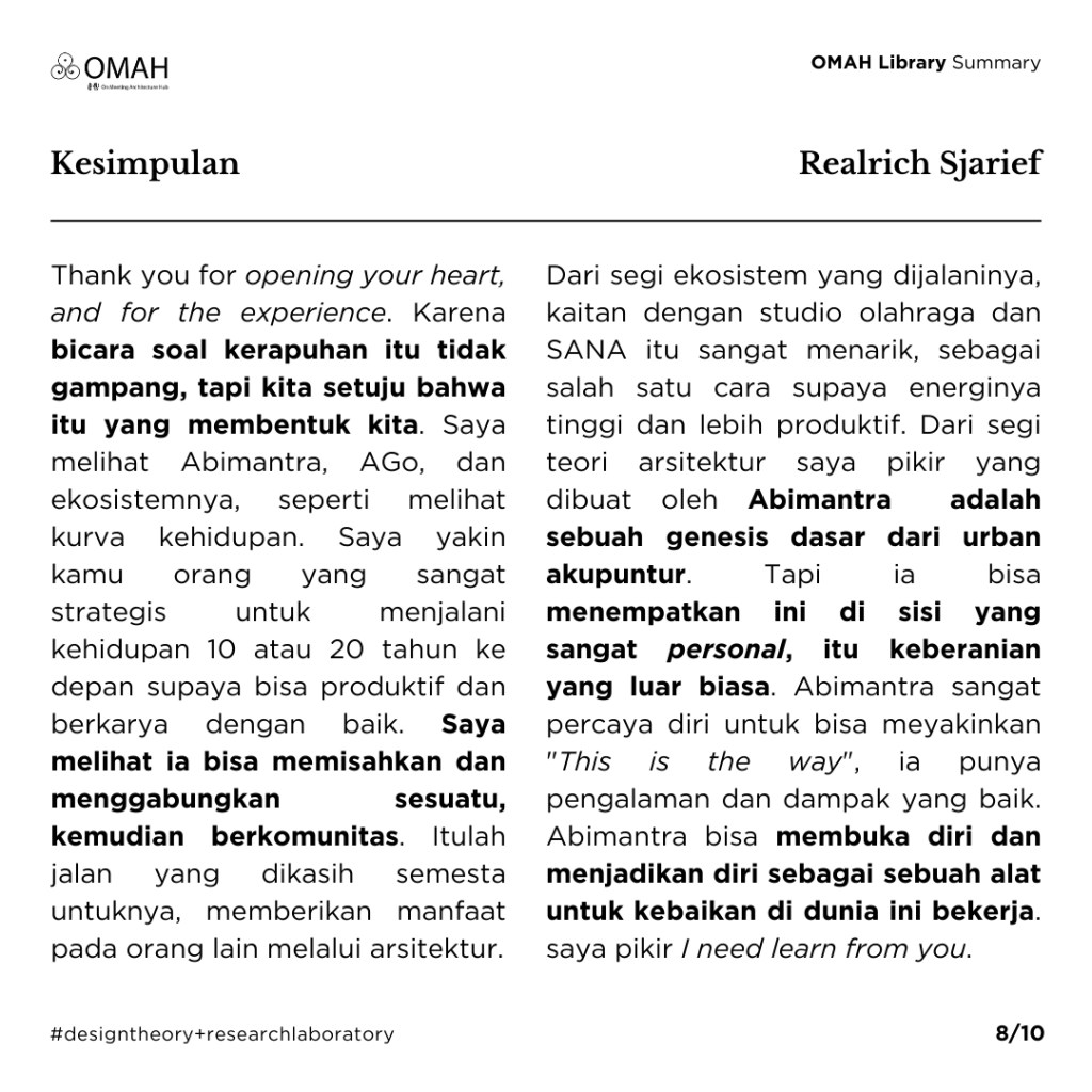 Dari Abimantra Pradhana kita belajar bangkit dari kehilangan, pentingnya memiliki rekan dan mengevaluasi apa yang penting dalam hidup. Keseimbangan pekerjaan dan kehidupan pribadi, efisiensi di kota, dan kecukupan menjadi visi yang ia perjuangkan melalui dirinya sendiri, keluarga, AGo, SANA, dan komunitas di dalamnya.
