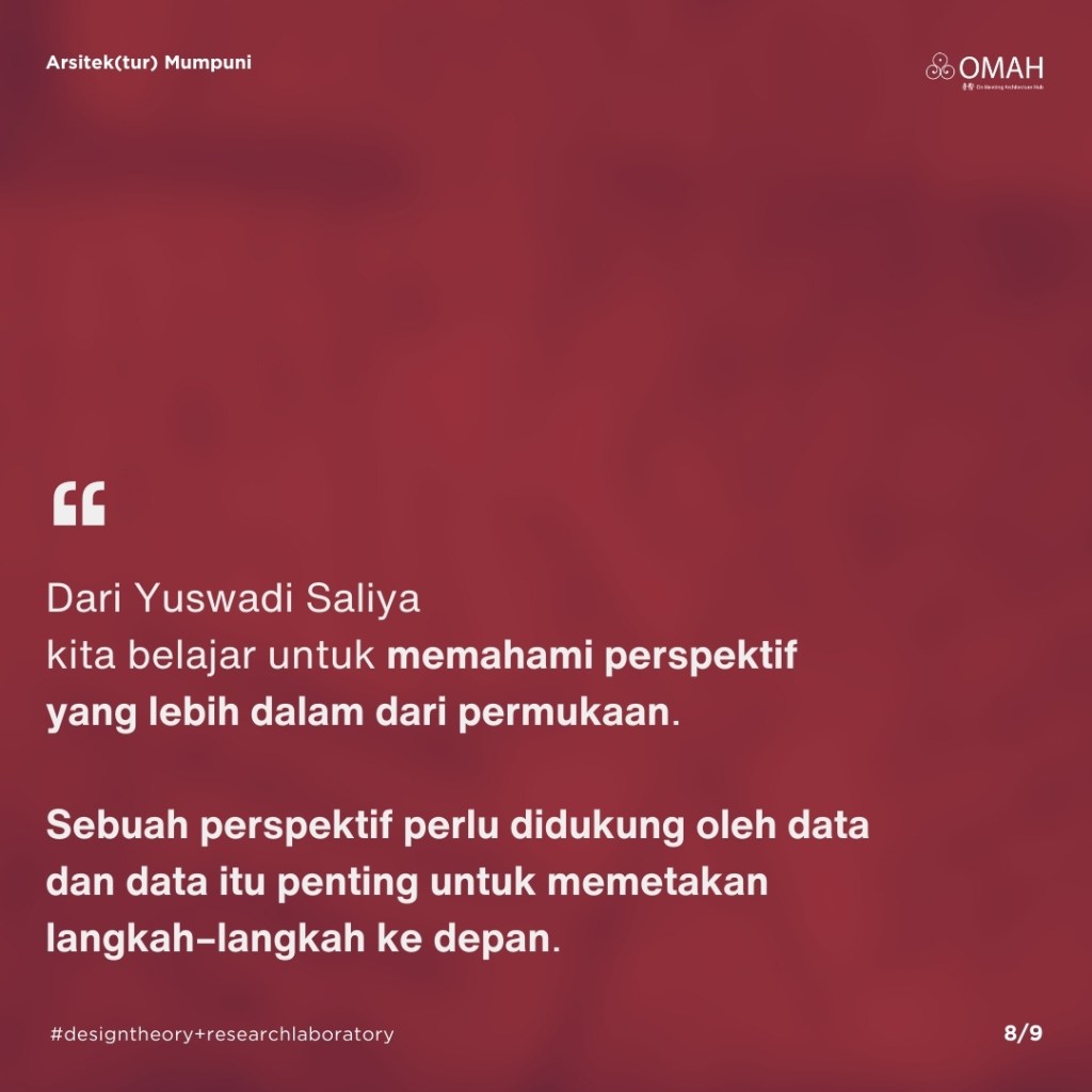 Memandang arsitektur tidak cukup hanya dengan satu kacamata karena setiap orang memiliki perspektif masing-masing dalam usaha yang sedang diperjuangkan. Untuk memperkaya sebuah perspektif diperlukan waktu, kedalaman berpikir, keberagaman wawasan, pengalaman, dan konsistensi. Seperti Yuswadi Saliya, Arsitek Mumpuni Indonesia yang menjadi saksi pertumbuhan arsitektur di Indonesia dari tahun 1950-an hingga sekarang.
