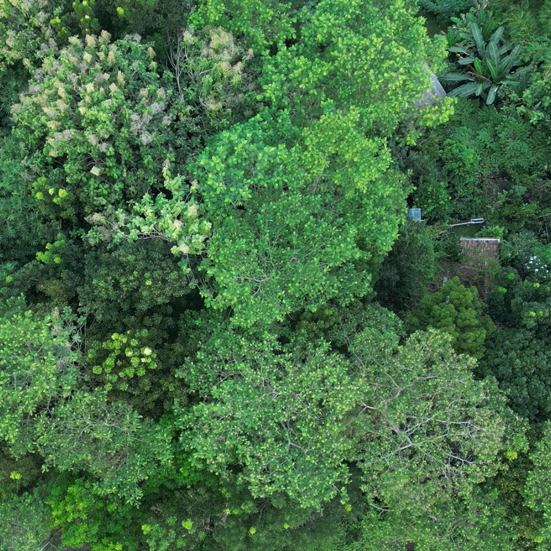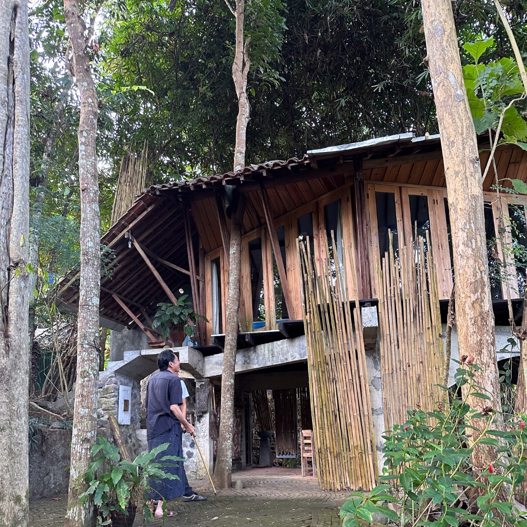 Foto-foto ini adalah refleksi kami saat mengunjungi rumah Eko Prawoto tahun lalu. Kami mencoba mengambil foto dari atas, tetapi menariknya rumah Pak Eko tertutup rimbunan pepohonan. Kami merenungkan bahwa pepohonanlah yang justru menaungi arsitekturnya, menciptakan suasana nyaman dan menandakan bahwa arsitekturnya tunduk dan beriringan dengan alam. Itulah kesan kami terhadap arsitektur dari figur Eko Prawoto.