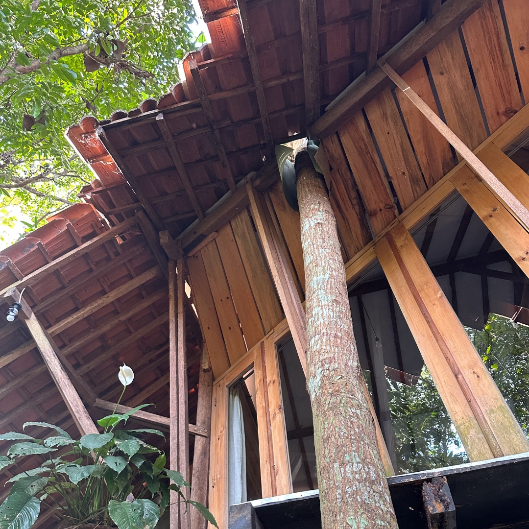 Salah satu elemen menarik yang memperlihatkan sikap Pak Eko adalah pohon yang menembus atap. Dengan sikap mengalah, ia melubangi atapnya agar pohon tetap berdiri, di sekelilingnya terdapat lapisan pelindung dari tampias hujan. Pepohonan yang terlihat acak ini sebenarnya upaya untuk tidak memotong kayu yang kemudian menciptakan polanya sendiri. Pohon-pohon membentuk order seperti tumbuh setapak demi setapak, mengajarkan kami bahwa desain tidak harus instan. Ia bisa tumbuh perlahan, beriringan dengan alam dan semua pertimbangan parameter yang lebih detail. Dengan sumber daya yang terbatas, di sinilah empati dalam arsitektur muncul.