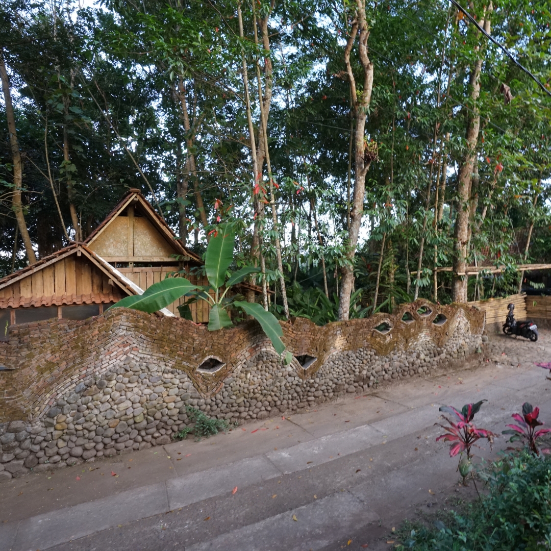 Arsitektur yang tumbuh menghasilkan massa terpecah-pecah, dibatasi oleh pohon-pohon yang tumbuh jauh sebelum arsitekturnya hadir, juga mengikuti kontur tanah yang menurun menyapa sungai. Batu yang kokoh dibuat menari di atas lahan dan pagar. Setiap sudut terajut, menyatukan alam dan hunian. Di sana kami merasa seperti berjalan bersama orang-orang tersayang, para tukang, dan semua jiwa yang datang ke rumah tersebut untuk belajar bersama.