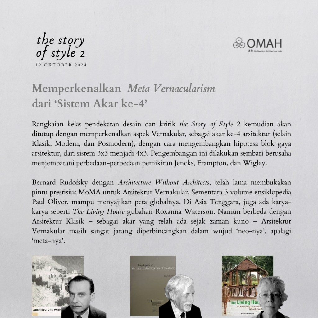 Pertemuan terakhir dari seri SOS2 akan difokuskan hanya pada pengenalan unsur Vernakular sebagai akar ke-4 arsitektur (selain Klasik, Modern, dan Posmodern).