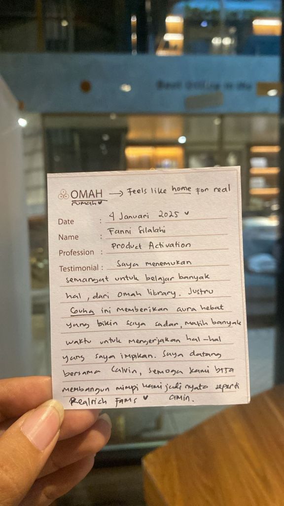 Saya menemukan semangat untuk belajar banyak hal, dari omah library. Justru Guha ini memberikan aura hebat yang bikin saya sadar, masih banyak waktu untuk mengerjakan hal-hal yang saya impikan. Saya datang bersama calvin, semoga kami bisa membangun mimpi kami jadi nyata seperti Realrich Fams