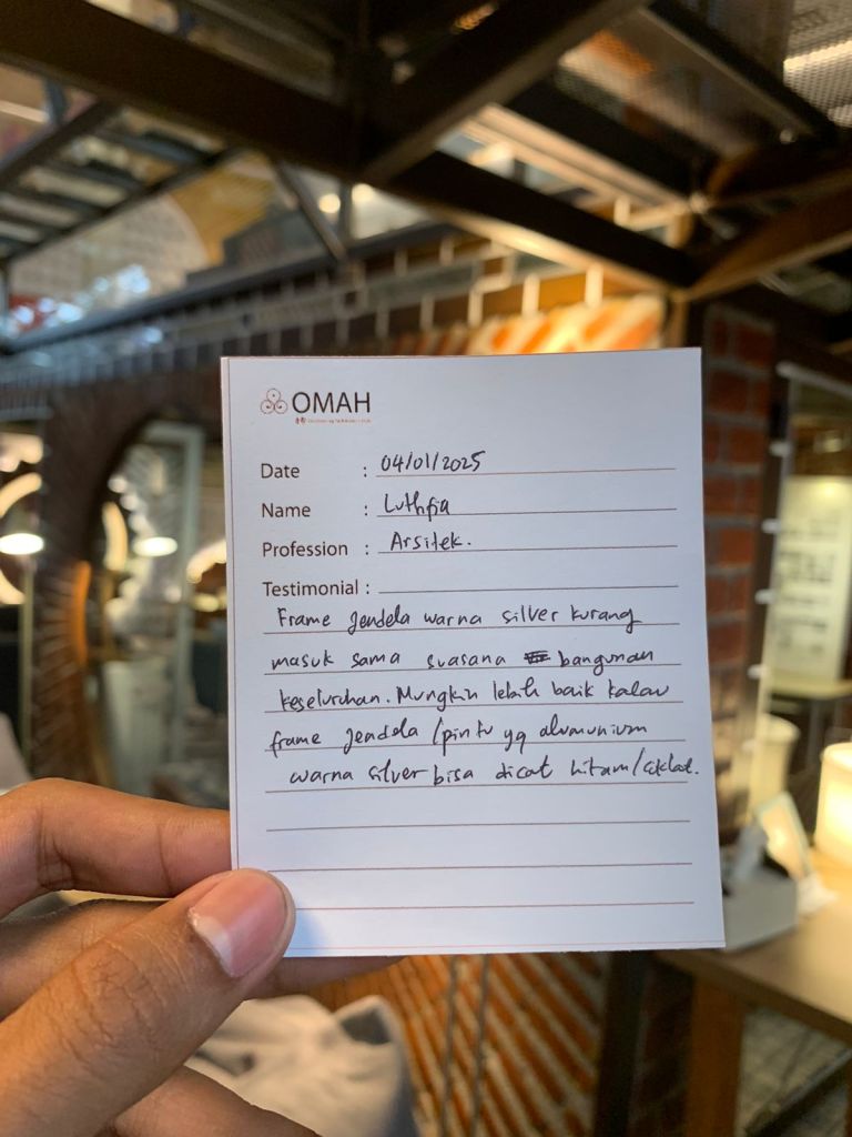 Frame jendela warna silver kurang masuk sama suasana bangunan keseluruhan. Mungkin lebih baik kalau frame jendela/pintu yang alumunium warna silver bisa di cat hitam/coklat.