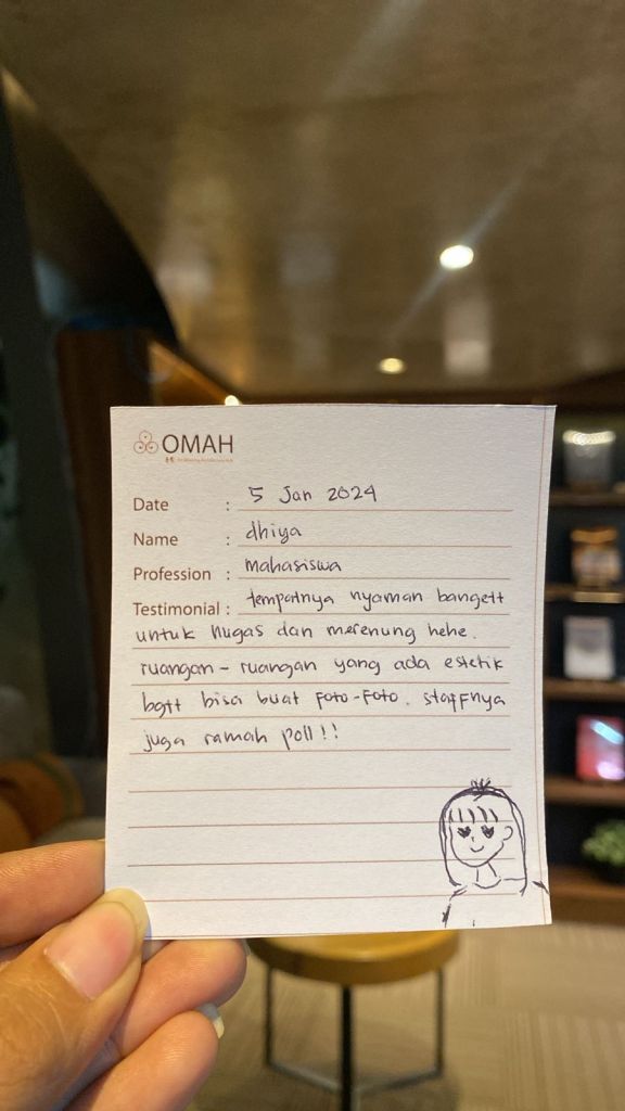 Tempatnya nyaman banget untuk nugas dan merenung hehe, ruangan-ruangan yang ada estetik banget bisa buat foto-foto, staffnya juga ramah poll !!