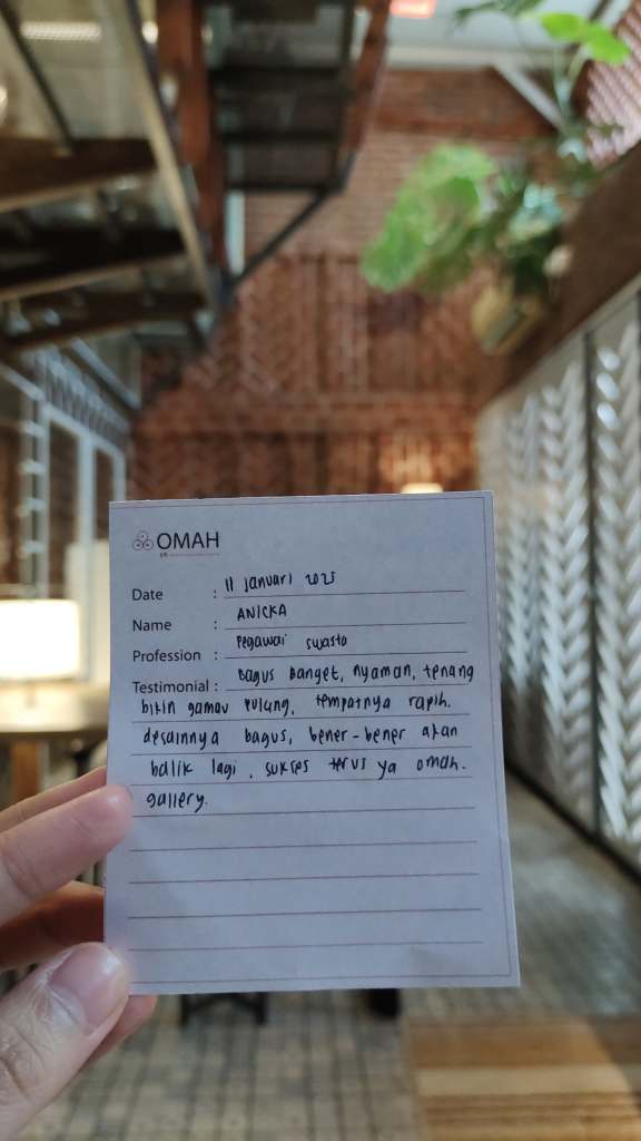 Bagus banget, nyaman, tenang bikin gamau pulang, tempatnya rapih, desainnya bagus, bener-bener akan balik lagi. Sukses terus ya omah gallery