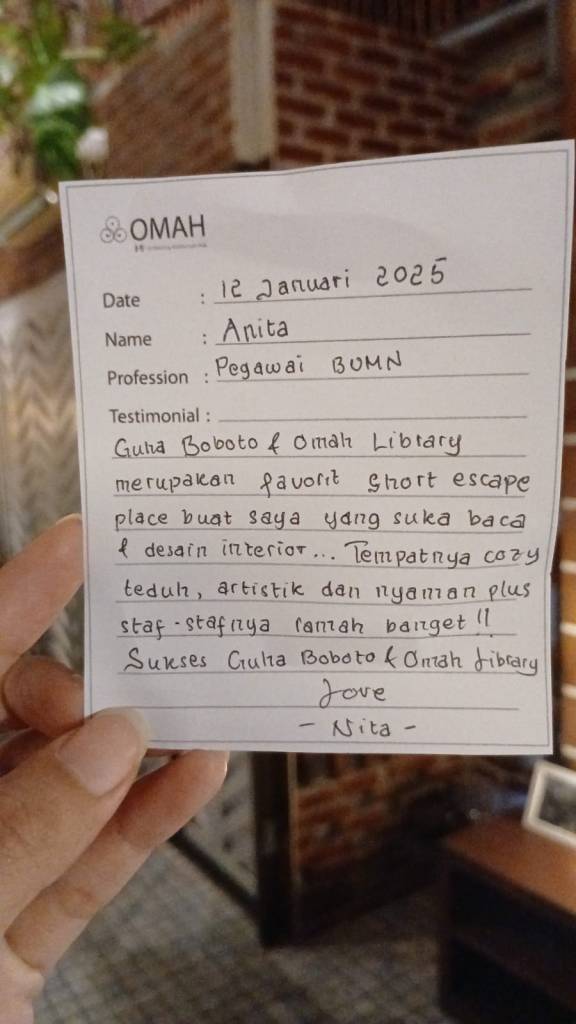 Guha Boboto & Omah Library merupakan favorit short escape place buat saya yang suka baca & desain interior… Tempatnya cozy teduh, artistik dan nyaman plus staf-stafnya ramah banget !!