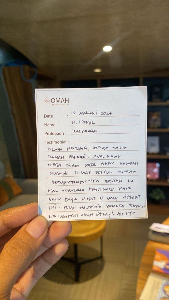 Kesan pertama berasa masuk rumah pribadi. Awal masuk biasa-biasa saja, baru sesudah masuk di buat terdiam dengan berarsitekturnya. Banyak hal – hal terutama konstruksi yang baru saya lihat di omah library ini. Pesan terakhir semoga semakin bertambah Omah Library lainnya