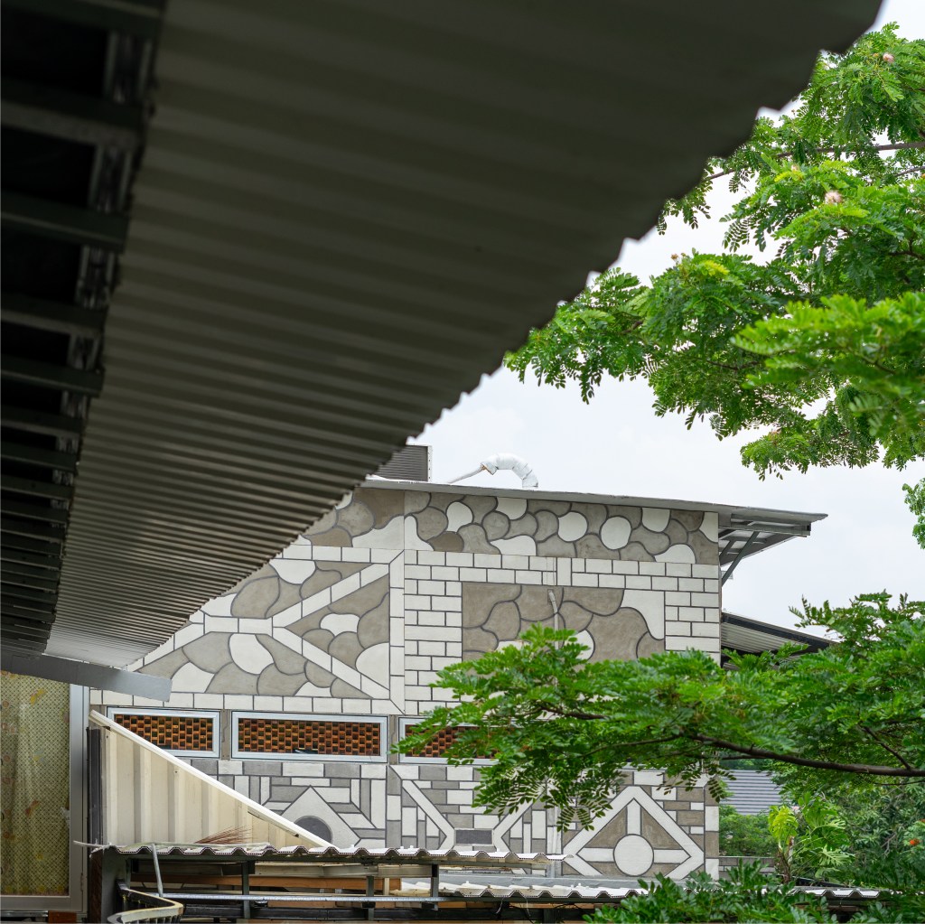 Goresan-goresan tangan para pengrajin silih berganti menandai estetika yang bersahaja di courtyard, seperti dinding dapur dan dinding sky studio yang mereka gambar mengikuti pola-pola bata.