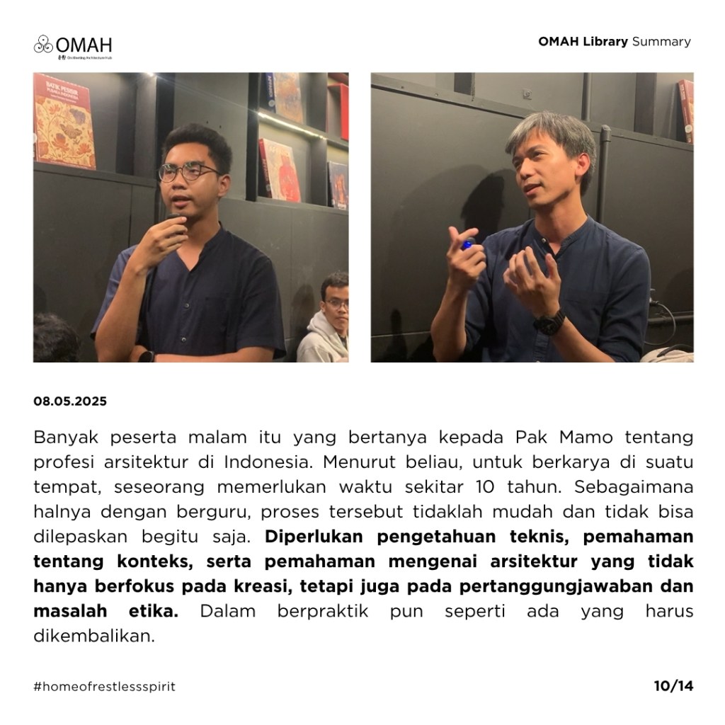 Banyak peserta malam itu yang bertanya kepada Pak Mamo tentang profesi arsitektur di Indonesia. Menurut beliau, untuk berkarya di suatu tempat, seseorang memerlukan waktu sekitar 10 tahun. Sebagaimana halnya dengan berguru, proses tersebut tidaklah mudah dan tidak bisa dilepaskan begitu saja. Diperlukan pengetahuan teknis, pemahaman tentang konteks, serta pemahaman mengenai arsitektur yang tidak hanya berfokus pada kreasi, tetapi juga pada pertanggungjawaban dan masalah etika. Dalam berpraktik pun seperti ada yang harus dikembalikan.