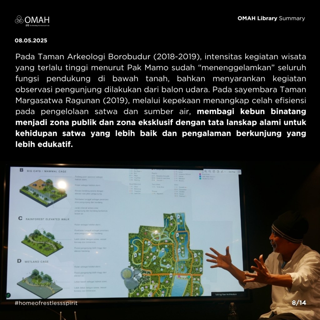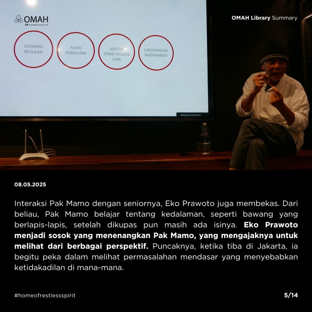 Semua dilakukan Pak Mamo dengan penuh totalitas, sekalipun ia tahu usulannya tidak akan diterima atau menyalahi brief yang diberikan. Ada respons alami yang terbentuk dari pengalaman masa kecil dan pelatihan sebagai arsitek, kemudian coba disampaikan dengan jujur dan apa adanya oleh Pak Mamo. Tak jarang audiens malam hari itu tertawa karena pembawaan beliau yang jenaka, tetapi mungkin juga karena tidak habis pikir dengan ide-idenya.
