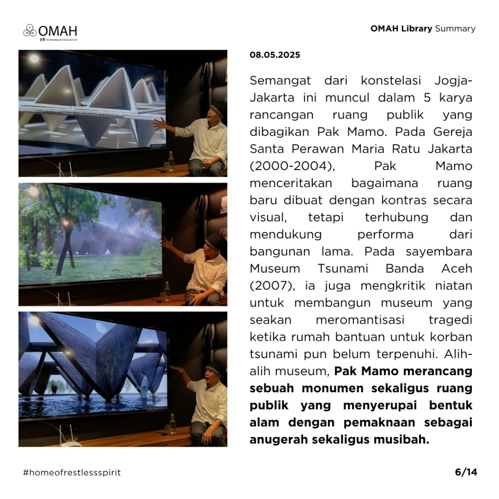 Semangat dari konstelasi Jogja-Jakarta ini muncul dalam 5 karya rancangan ruang publik yang dibagikan Pak Mamo. Pada Gereja Santa Perawan Maria Ratu Jakarta (2000-2004), Pak Mamo menceritakan bagaimana ruang baru dibuat dengan kontras secara visual, tetapi terhubung dan mendukung performa dari bangunan lama. Pada sayembara Museum Tsunami Banda Aceh (2007), ia juga mengkritik niatan untuk membangun museum yang seakan meromantisasi tragedi ketika rumah bantuan untuk korban tsunami pun belum terpenuhi. Alih-alih museum, Pak Mamo merancang sebuah monumen sekaligus ruang publik yang menyerupai bentuk alam dengan pemaknaan sebagai anugerah sekaligus musibah.
