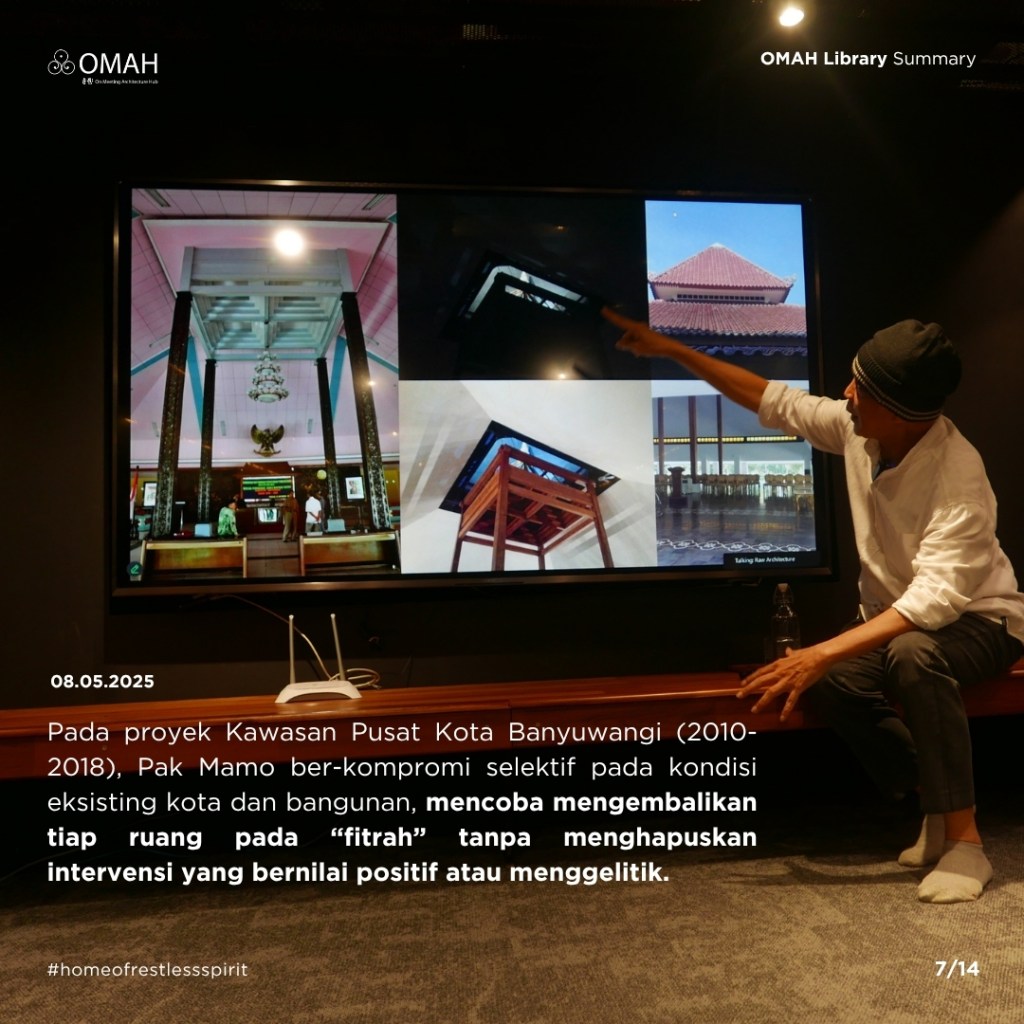 Pada proyek Kawasan Pusat Kota Banyuwangi (2010-2018), Pak Mamo ber-kompromi selektif pada kondisi eksisting kota dan bangunan, mencoba mengembalikan tiap ruang pada “fitrah” tanpa menghapuskan intervensi yang bernilai positif atau menggelitik. Pada Taman Arkeologi Borobudur (2018-2019), intensitas kegiatan wisata yang terlalu tinggi menurut Pak Mamo sudah “menenggelamkan” seluruh fungsi pendukung di bawah tanah, bahkan menyarankan kegiatan observasi pengunjung dilakukan dari balon udara. Pada sayembara Taman Margasatwa Ragunan (2019), melalui kepekaan menangkap celah efisiensi pada pengelolaan satwa dan sumber air, membagi kebun binatang menjadi zona publik dan zona eksklusif dengan tata lanskap alami untuk kehidupan satwa yang lebih baik dan pengalaman berkunjung yang lebih edukatif.