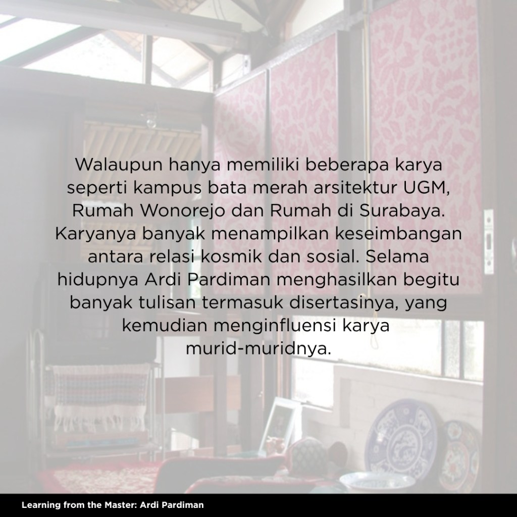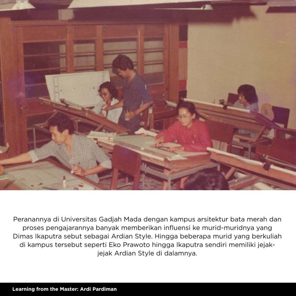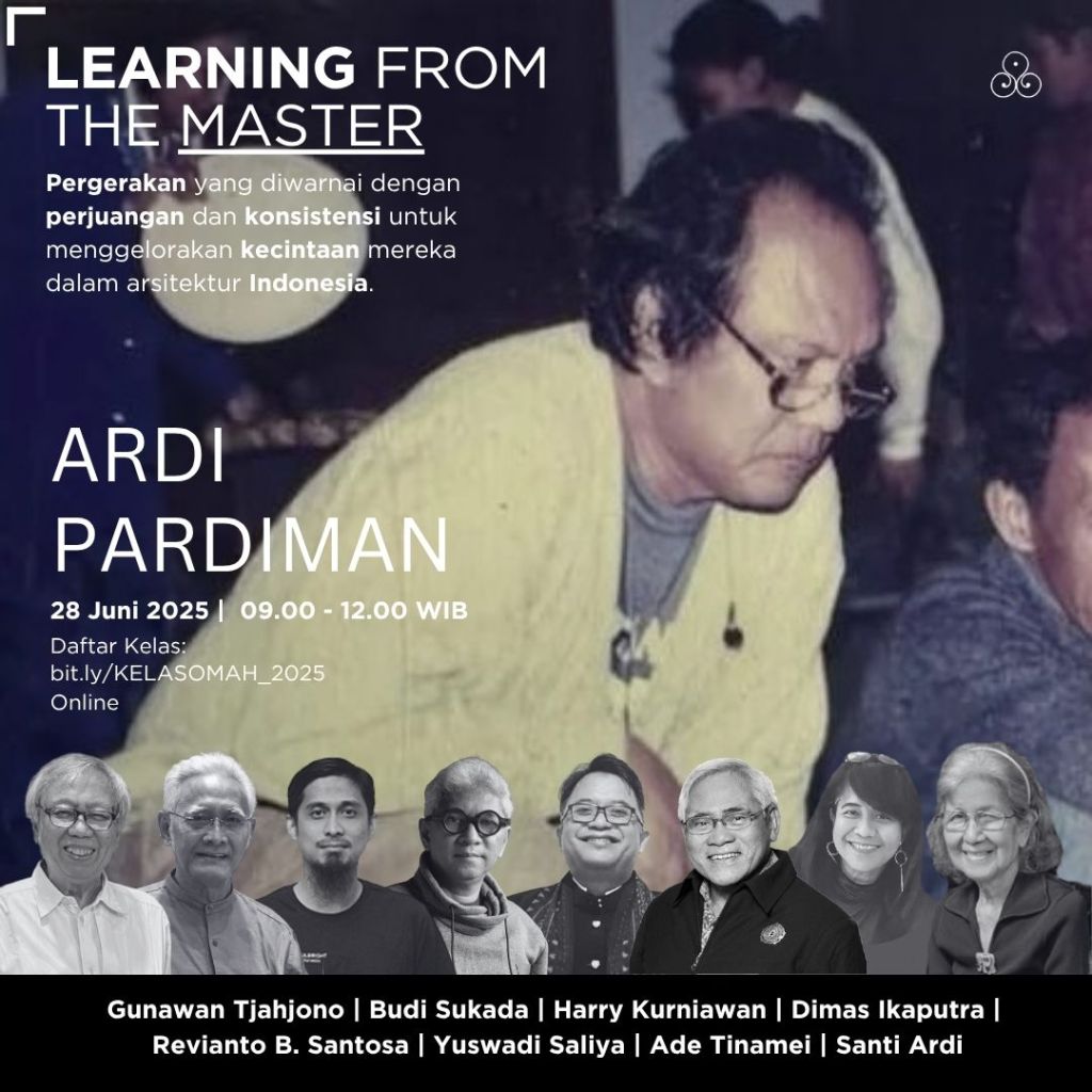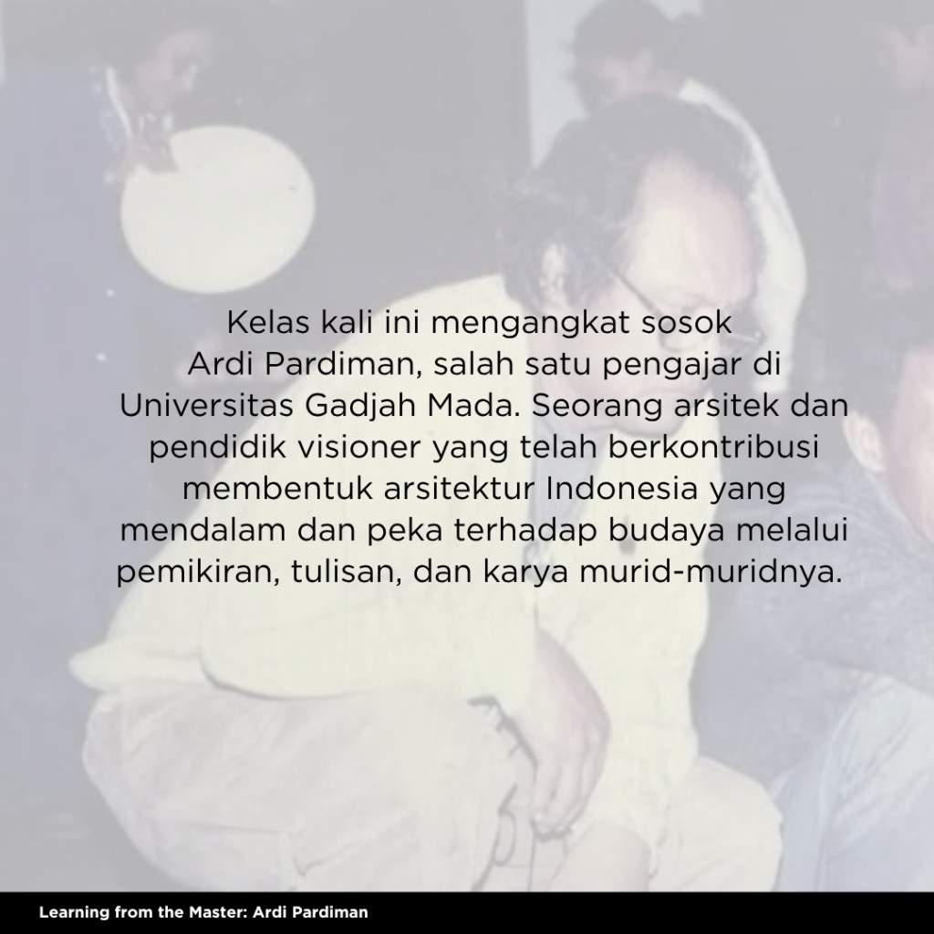 Learning from the Master hadir kembali setelah terakhir dilaksanakan pada 2017 lalu untuk membahas tentang Alejandro Aravena. Kelas kali ini mengangkat sosok Ardi Pardiman, salah satu pengajar di Universitas Gadjah Mada. Seorang arsitek dan pendidik visioner yang telah membentuk arsitektur Indonesia melalui pemikiran mendalam dan kepekaan budaya melalui karya murid-muridnya. Peranannya di Universitas Gadjah Mada dengan kampus arsitektur bata merah dan proses pengajarannya banyak memberikan influensi ke murid-muridnya yang Dimas Ikaputra sebut sebagai Ardian Style. Hingga beberapa murid yang berkuliah di kampus tersebut seperti Eko Prawoto hingga Ikaputra sendiri memiliki jejak-jejak Ardian Style di dalamnya.