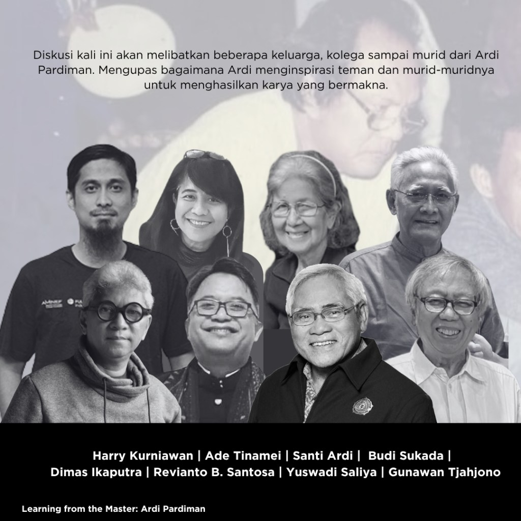 Diskusi kali ini akan melibatkan beberapa keluarga, kolega sampai murid dari Ardi Pardiman, seperti. Mengupas bagaimana Ardi menginspirasi murid-muridnya untuk menghasilkan karya yang bermakna.