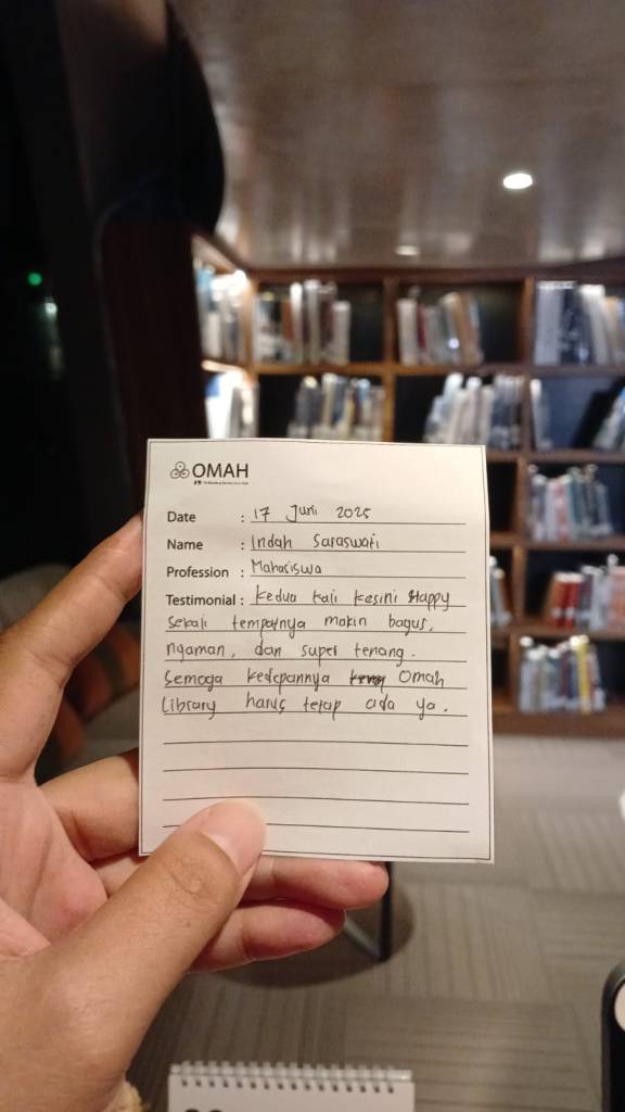 Kedua kali kesini happy sekali tempatnya makin bagus, nyaman dan super tenang. semoga kedepannya OMAH Library harus tetap ada ya.