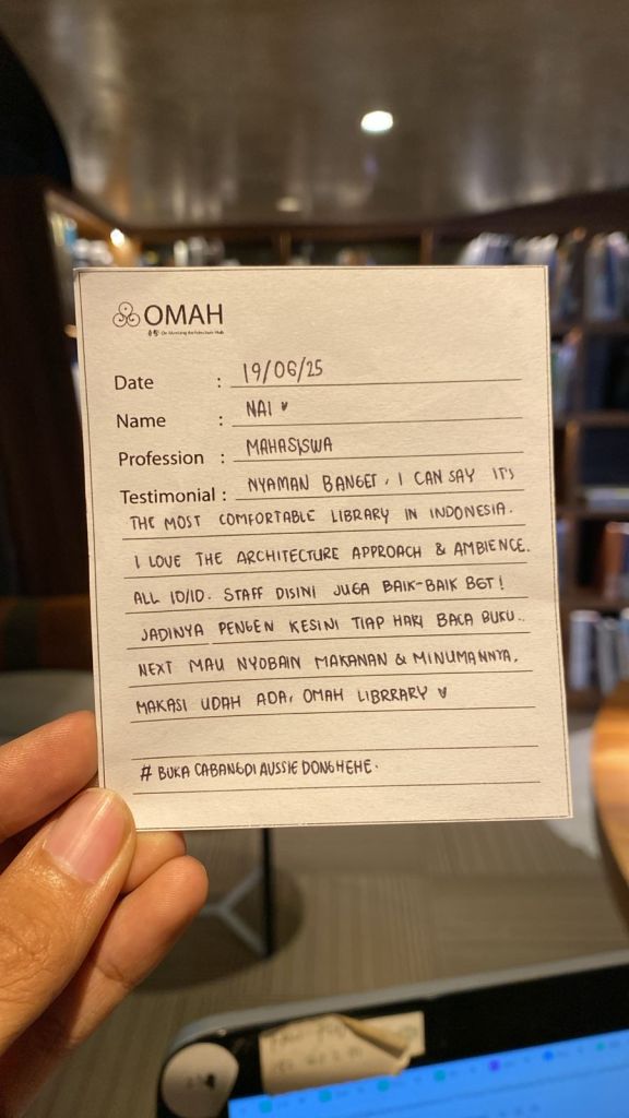 Nyaman banget, i can says it’s the most Comfortable Library in Indonesia. i love the Architecture Approach & Ambiance. All 10/10. Staff disini juga baik-baik banget! jadinya pengen kesini tiap hari baca buku. Next mau nyobain makanan & minumannya. Makasih Udah ada, OMAH Library ❤