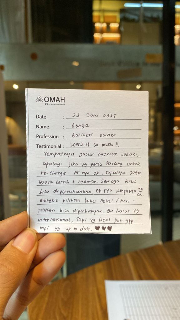 Tempatnya jujur nyaman sekali, apalagi jika perlu tenang untuk Re-Charge, Ac nya oke, Sofanya juga terasa bersih dan nyaman, semoga terus bisa dipertahankan. oh iya lampunya juga ok mungkin pilihan buku Novel/non Fiction bisa diperbanyak, ga harus yang internasional, tapi yang local pun gpp tapi yang up to date ❤❤❤