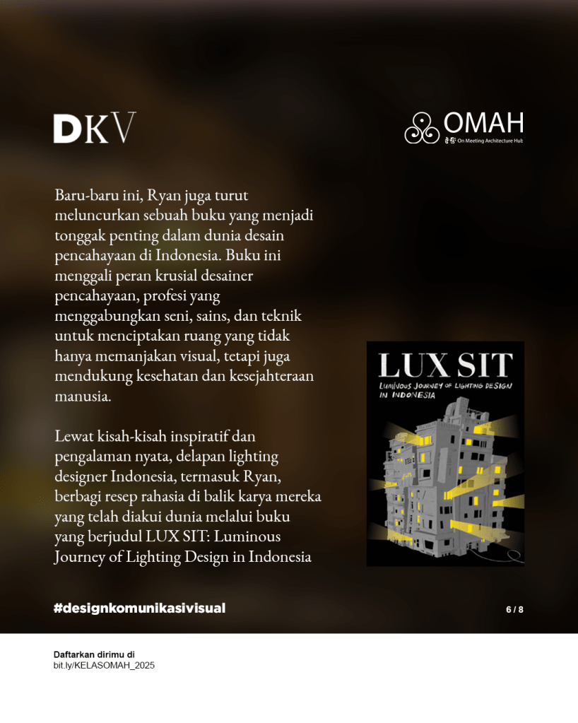 Tahun ini, Ryan bersama 7 desainer lainnya meluncurkan buku LUX SIT yang menyoroti pentingnya peran lighting designer dalam menciptakan ruang yang mendukung estetika sekaligus kesejahteraan manusia. Buku ini memperkenalkan konsep seperti human-centric lighting, integrasi dengan arsitektur, hingga praktik berkelanjutan, sekaligus membuka mata akan potensi profesi ini di Indonesia.