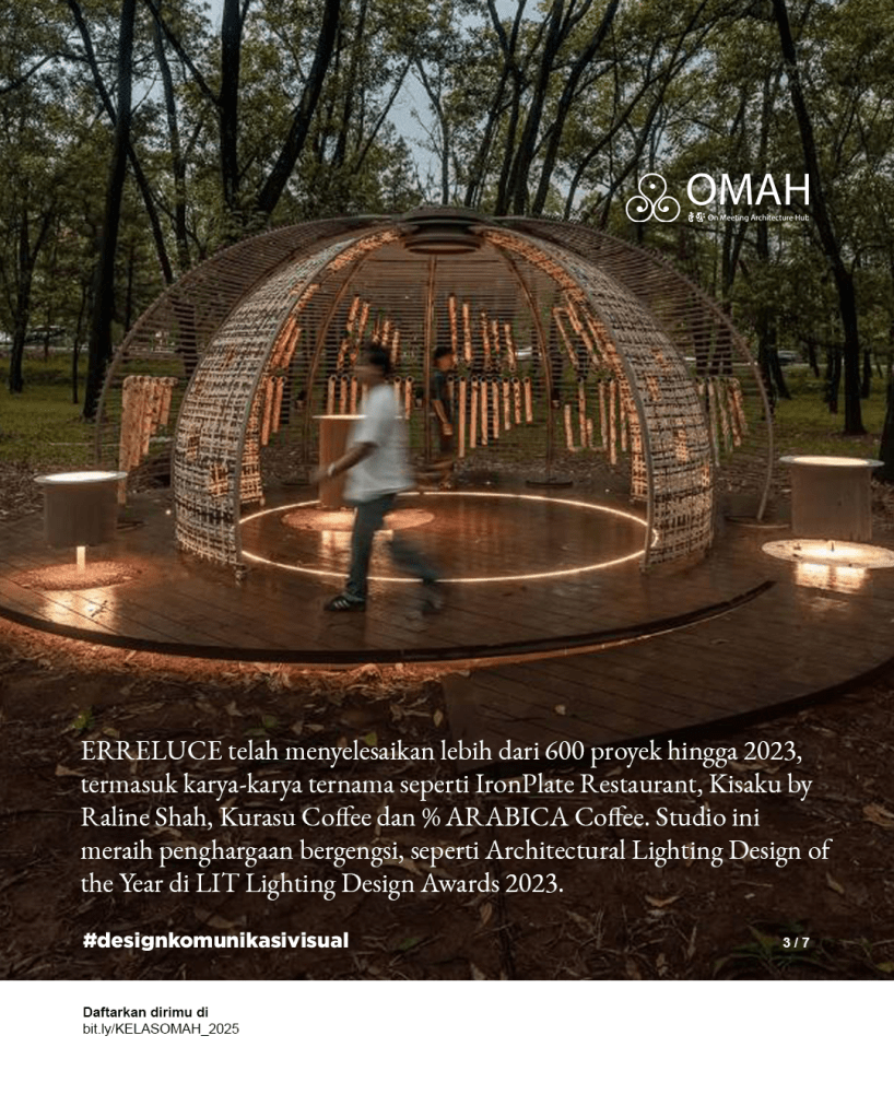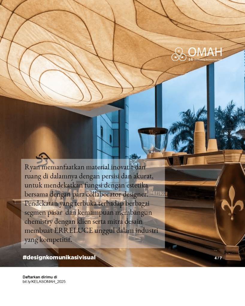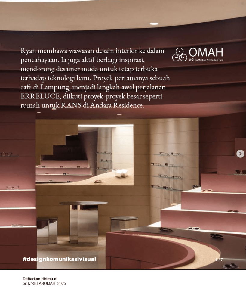Ia juga aktif berbagi dan mendorong desainer muda untuk tetap terbuka terhadap teknologi baru. Klien pertamanya, seorang dokter gigi di Lampung, menjadi langkah awal perjalanan ERRELUCE, diikuti proyek-proyek besar seperti rumah untuk RANS di Andara Residence.