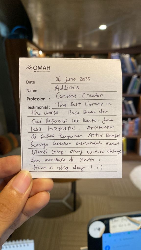 The Best Library in the World. baca buku dan cari referensi ide konten jadi lebih insight full. Arsitektur di setiap bangunan Artsy banget, semoga semakin menambah minat literasi orang – orang untuk datang dan membaca di OMAH! Have A Nice Day! 😊