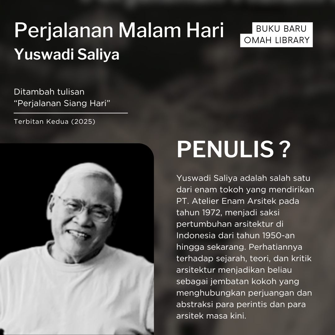 Penerbitan buku Perjalanan Malam Hari yang kedua ini menjadi doa kami untuk Pak Yuswadi Saliya yang berulang tahun ke 87. Beliau adalah orang yang sudah memberikan konsistensinya selama enam dekade untuk arsitektur Indonesia. “Perjalanan Malam Hari” adalah sebuah refleksi terhadap realita ekosistem arsitektur Indonesia yang masih valid untuk sekarang. Malam hari adalah saat dimana seorang arsitek, pemikir berkontemplasi terhadap harapan, mimpi, energi yang memuncak dan seringkali rasa frustasi. Di saat-saat ini adalah sebuah titik hitam yang sulit, tidak bisa didefinisikan, sebuah titik yang tidak semua orang mau untuk menjalani. Daerah ini adalah daerah yang penuh keragu-raguan, sesaat sebelum subuh ketika banyak orang tertidur lelap. Disitulah kita mendapatkan kekuatan refleksi dari Yuswadi Saliya bahwa kita masih punya harapan, dan hal itu tertuangkan dalam tulisan baru “Perjalanan Siang Hari”