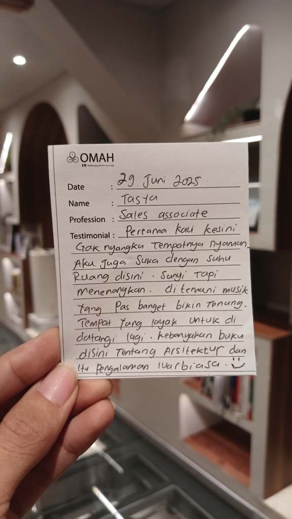 Pertama kali ke sini gak nyangka tempatnya nyaman, aku juga suka dengan suhu ruang disini, sunyi tapi menenangkan. ditemani musik yang pas banget bikin tenang, tempat yang layak untuk di datangi lagi, kebanyakan buku disini tentang arsitektur dan itu pengalaman luar biasa 😊
