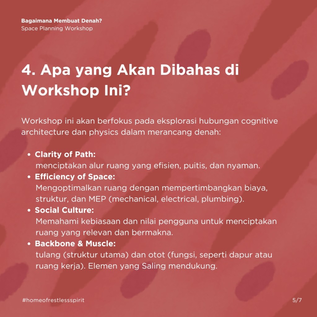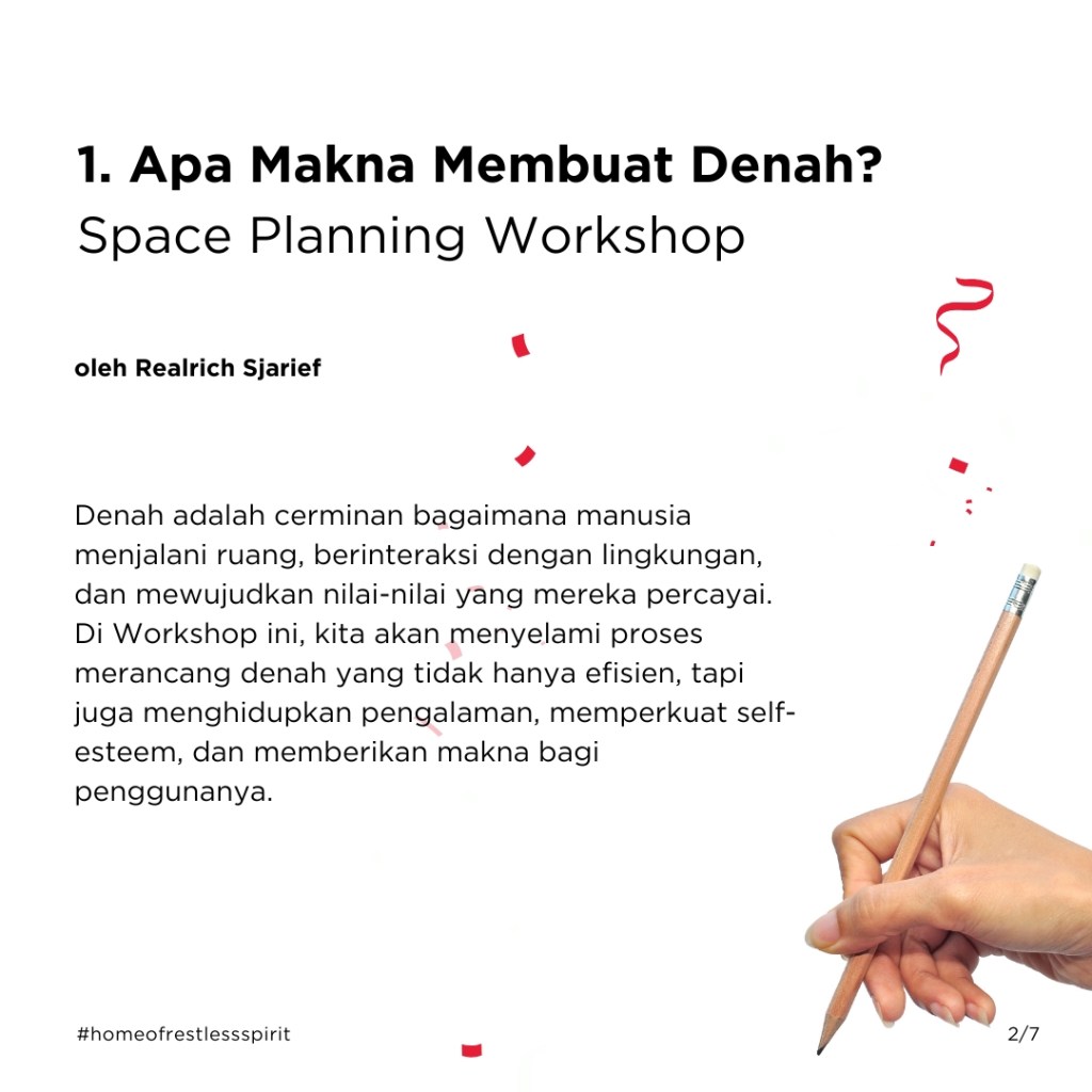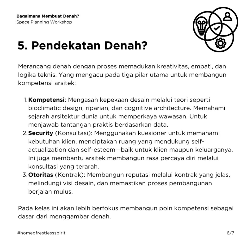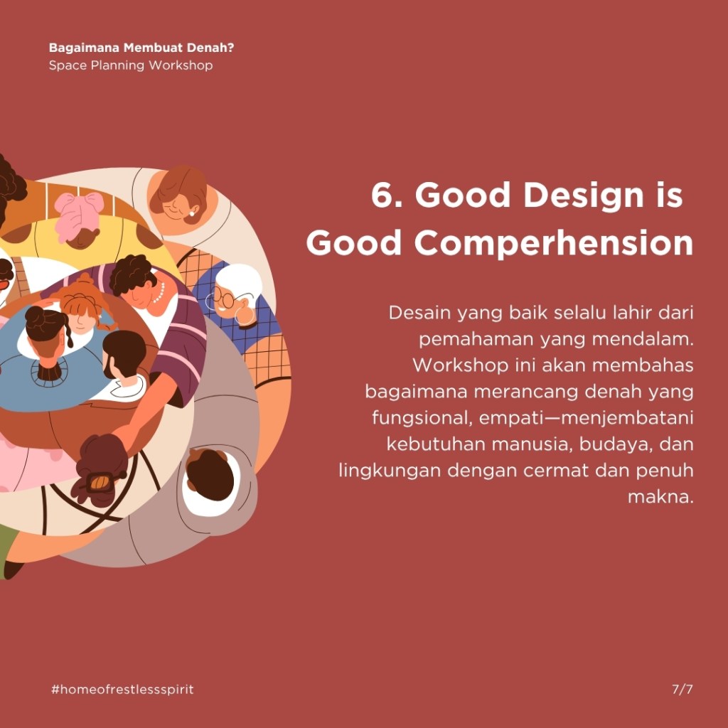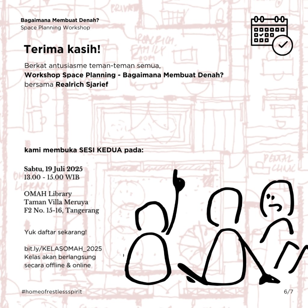 Sebulan yang lalu di Kelas-Workshop Denah OMAH Library, kami bersama kawan-kawan belajar dan berdiskusi bersama, tentang cara-cara menaklukkan jantung perancangan arsitektur, yaitu denah. Dalam diskusinya tidak ada yang benar atau salah, yang ada hanyalah instrumen, data, dan seberapa jauh konsekSabtu ini pada 19 Juli 2025, OMAH Library akan mengadakan Kelas Workshop Denah yang akan dipandu oleh Realrich Sjarief. Di workshop ini, kita akan menyelami proses merancang denah yang tidak hanya efisien, tapi juga menghidupkan pengalaman, memperkuat self-esteem, dan memberikan makna bagi penggunanya, berdasarkan dari pengalaman praktik yang nyata ditambah teori yang bisa digunakan dalam praktik sehari-hari.