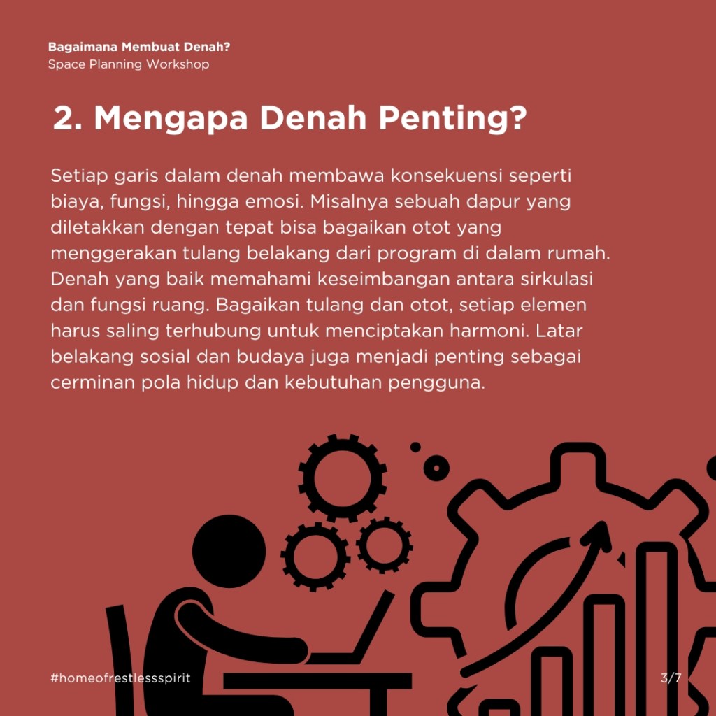 Contohnya, setiap garis dalam denah membawa konsekuensi seperti biaya, fungsi, hingga emosi. Sebuah dapur yang diletakkan dengan tepat bisa bagaikan otot yang menggerakan tulang belakang dari program di dalam rumah. Denah yang baik memahami keseimbangan antara struktur dan fungsi. Bagaikan tulang dan otot, setiap elemen harus saling terhubung untuk menciptakan harmoni. Konteks sosial dan budaya juga menjadi penting sebagai cerminan pola hidup dan kebutuhan pengguna.