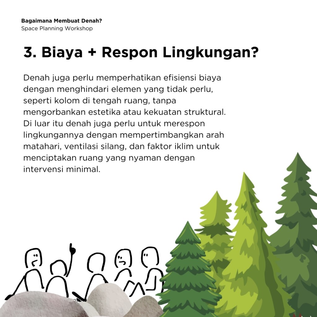 Denah juga perlu memperhatikan efisiensi biaya dengan menghindari elemen yang tidak perlu, seperti kolom di tengah ruang, tanpa mengorbankan estetika atau kekuatan struktural. Di luar itu semua denah juga perlu untuk merespon lingkungannya dengan mempertimbangkan arah matahari, ventilasi silang, dan faktor iklim untuk menciptakan ruang yang nyaman dengan intervensi minimal, tentunya dengan berdiskusi dengan para engineer.