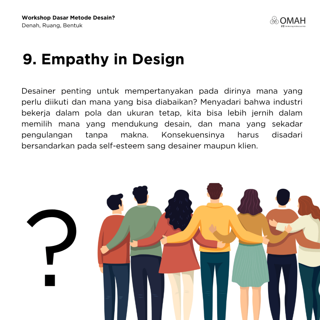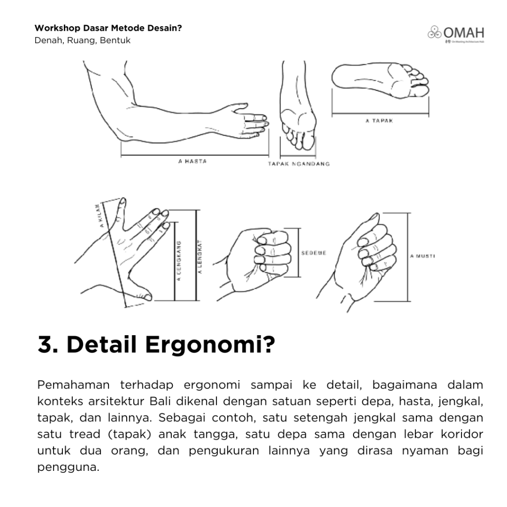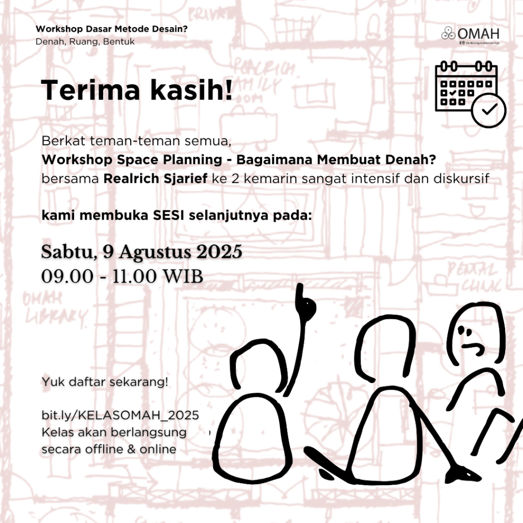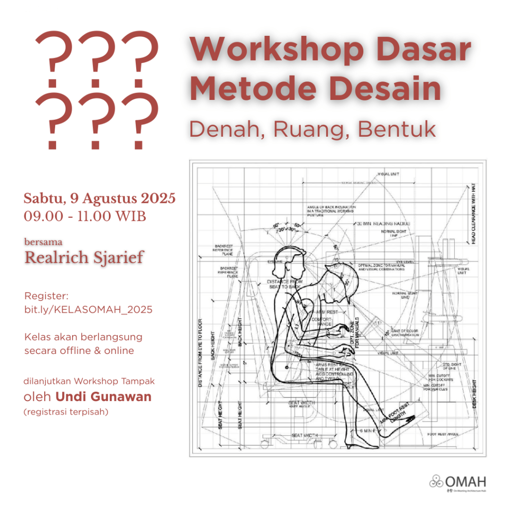 Sebulan yang lalu di Kelas-Workshop Denah OMAH Library, kami bersama kawan-kawan belajar dan berdiskusi bersama, tentang cara-cara menaklukkan jantung perancangan arsitektur, yaitu denah. Dalam diskusinya tidak ada yang benar atau salah, yang ada hanyalah instrumen, data, dan seberapa jauh konsekSabtu ini pada 19 Juli 2025, OMAH Library akan mengadakan Kelas Workshop Denah yang akan dipandu oleh Realrich Sjarief. Di workshop ini, kita akan menyelami proses merancang denah yang tidak hanya efisien, tapi juga menghidupkan pengalaman, memperkuat self-esteem, dan memberikan makna bagi penggunanya, berdasarkan dari pengalaman praktik yang nyata ditambah teori yang bisa digunakan dalam praktik sehari-hari.