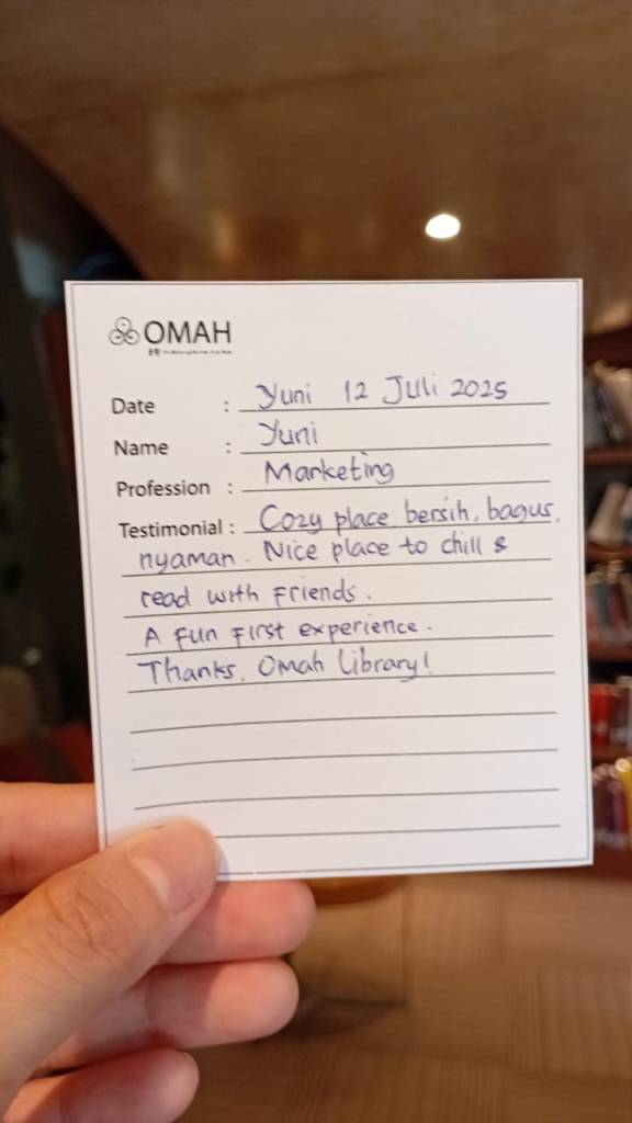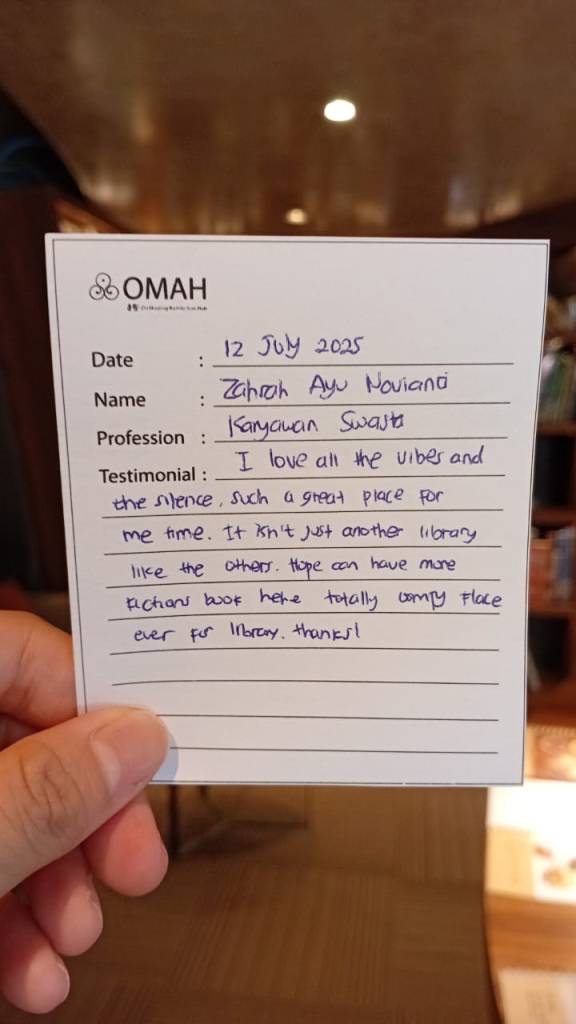 Cozy place, bersih, bagus, nyaman. Nice place to chill & read with friends. A fun first experience. Thanks OMAH Library!