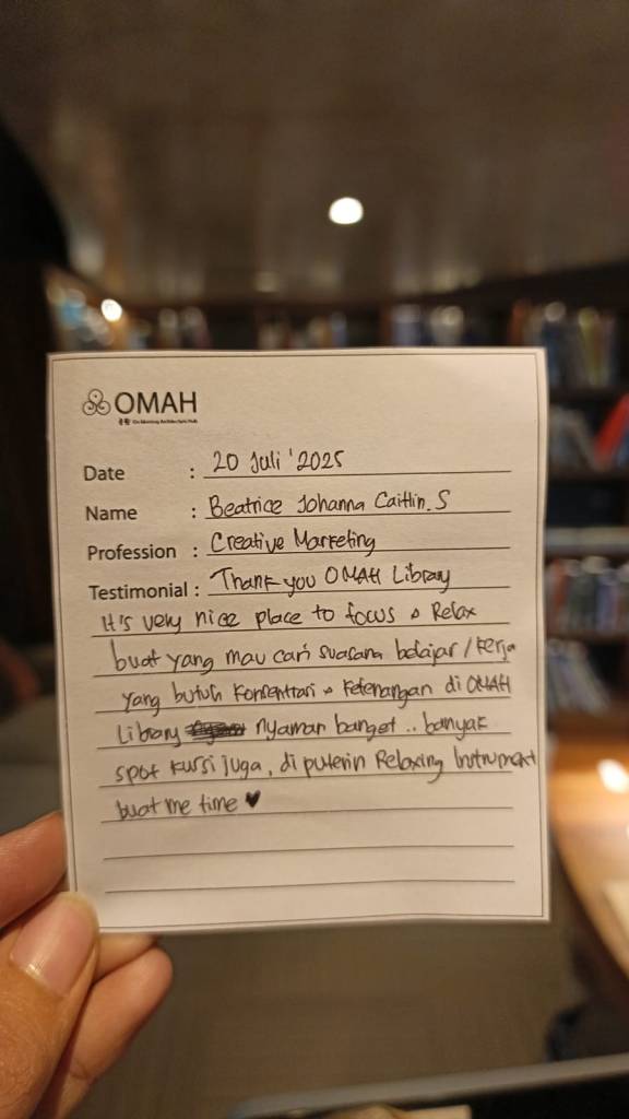 buat yang mau cari suasana belajar/kerja yang butuh konsentrasi & ketenangan di OMAH Library nyaman banget… banyak spot kursi juga, diputerin relaxing instrument buat me time ❤