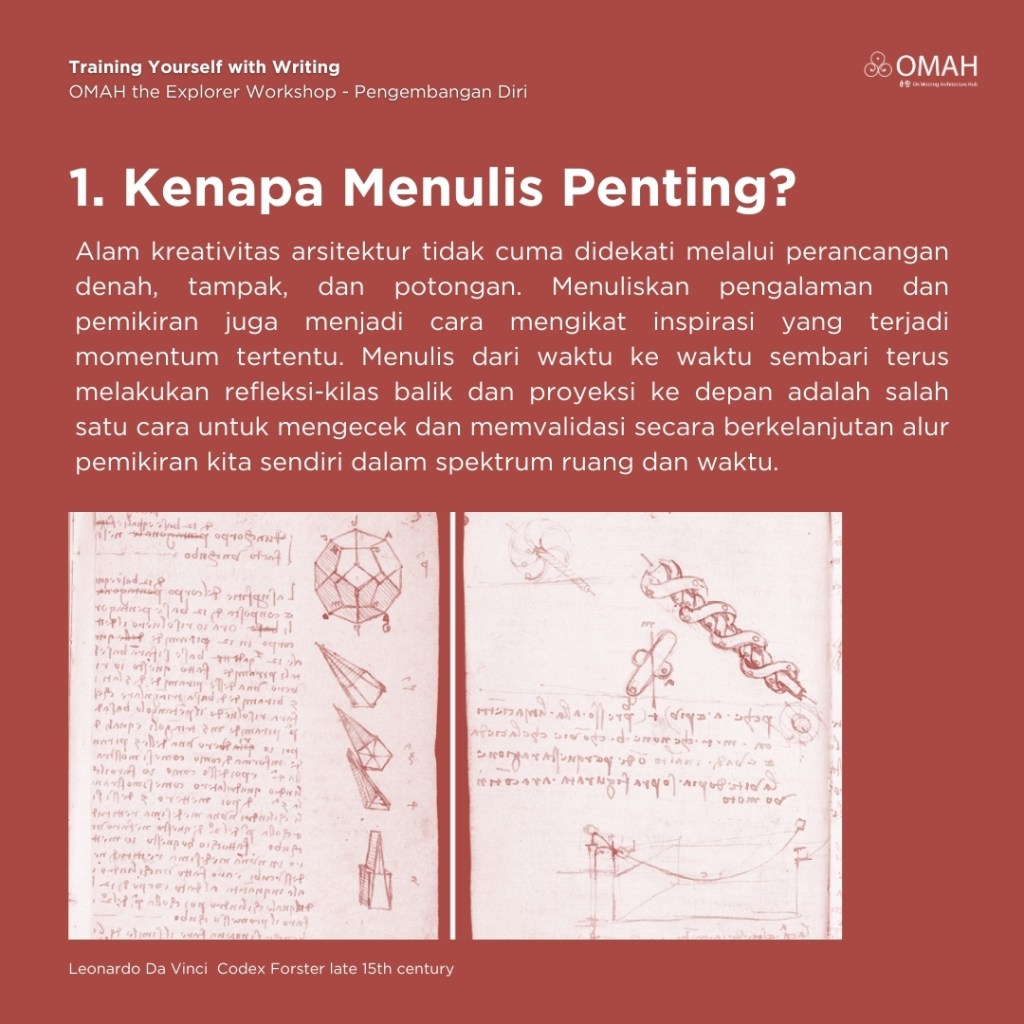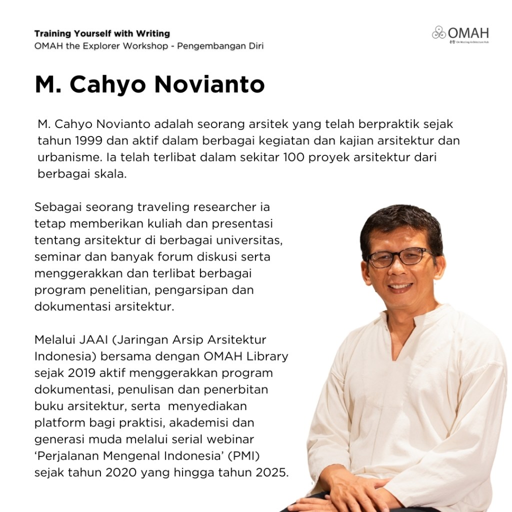 Dalam kesempatan ini, M. Cahyo Novianto, praktisi, traveling researcher, dan pendiri JAAI, akan berbagi tentang pentingnya menulis dalam kehidupan sehari-hari dan juga dalam praktik arsitektur.